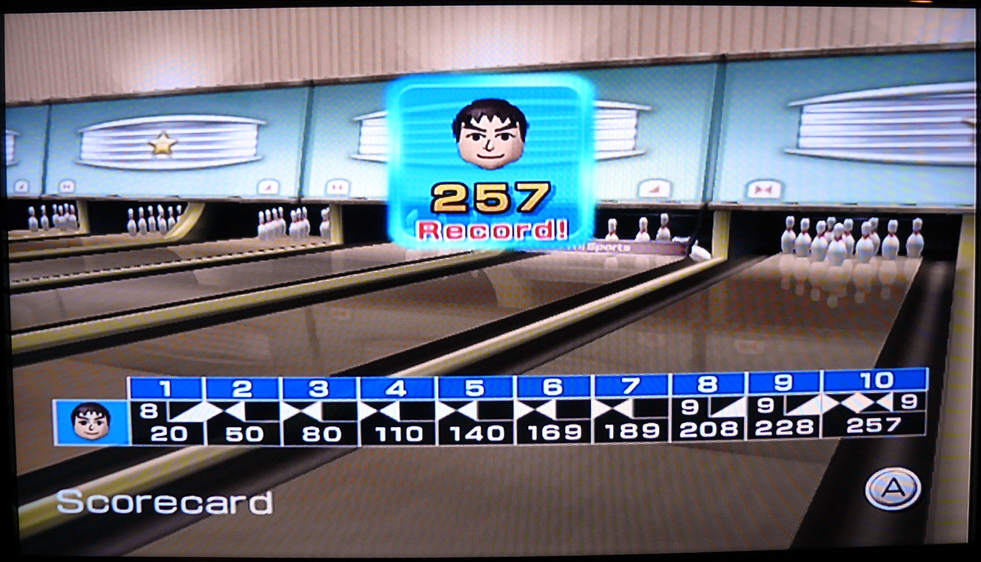 Last night, while playing Wii Sports’ Bowling for the Nintendo Wii, I bowled a 257! This is the highest score I have ever bowled, surpassing my previous high of 221 on February 23, 2002. But that was bowled in real life as opposed to in the video game world. My score is usually in the low to mid 100s, but my Wii score – prior to this 257 – has reached as high as the upper 100s.