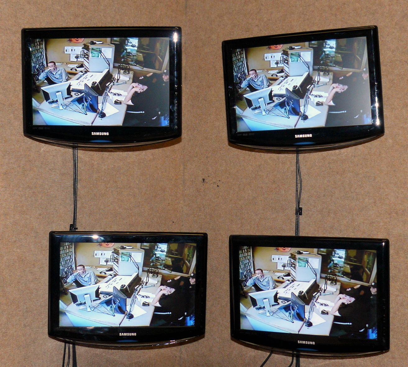 All four news production TVs were tuned to the Studio 1 webcam used exclusively for alumni weekend. Below, you see the football postgame in progress.