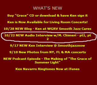 Last night, Ken Navarro left a comment on Facebook to my picture of me and him at during the meet-and-greet following April’s Smooth Jazz for Scholars concert. Not only was he complimentary of the picture, but he had positive feedback about our October 18 interview: