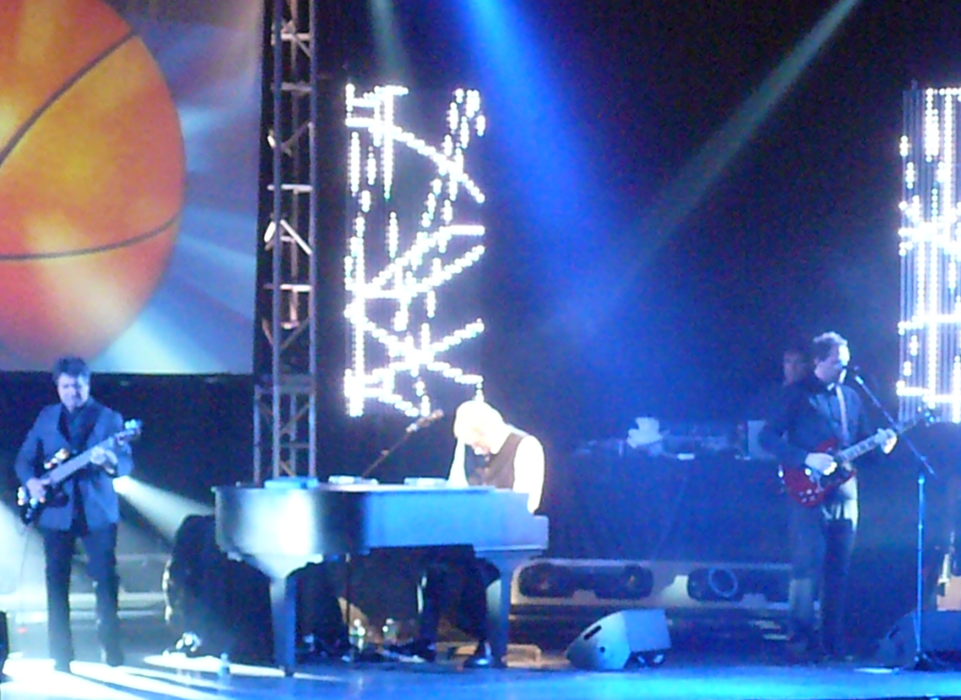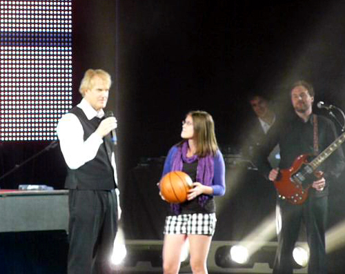 He stopped midway through and brought out an NBA regulation size basketball, signed by him and the band, for an audience member to dribble to the “Roundball Rock” beat: