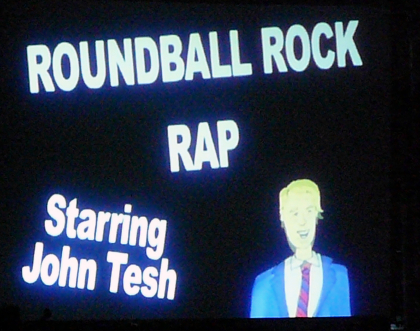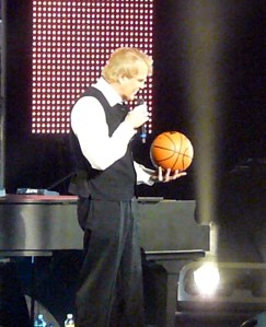 He stopped midway through and brought out an NBA regulation size basketball, signed by him and the band, for an audience member to dribble to the “Roundball Rock” beat: