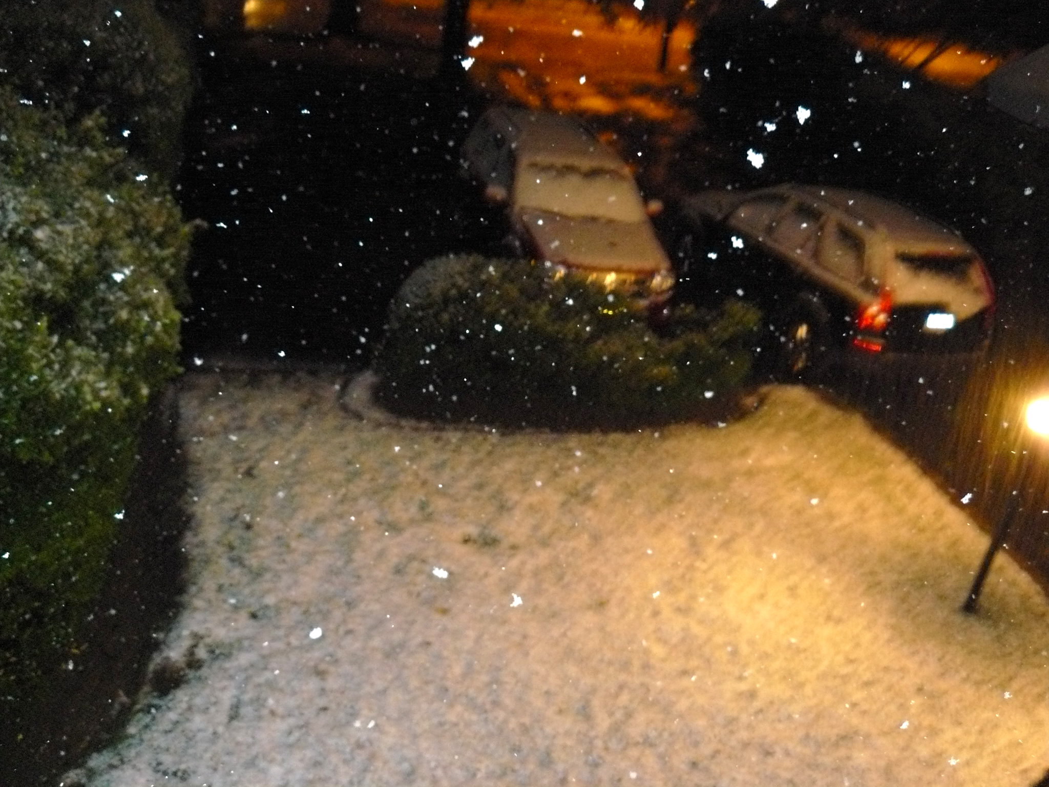 What fell at my house only stuck to the cars in the driveway and to parts of the grass. Any cold surface accumulated snow.