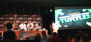 The rest of the panel was four cast members: the voices of three of the four turtles and their sensei.