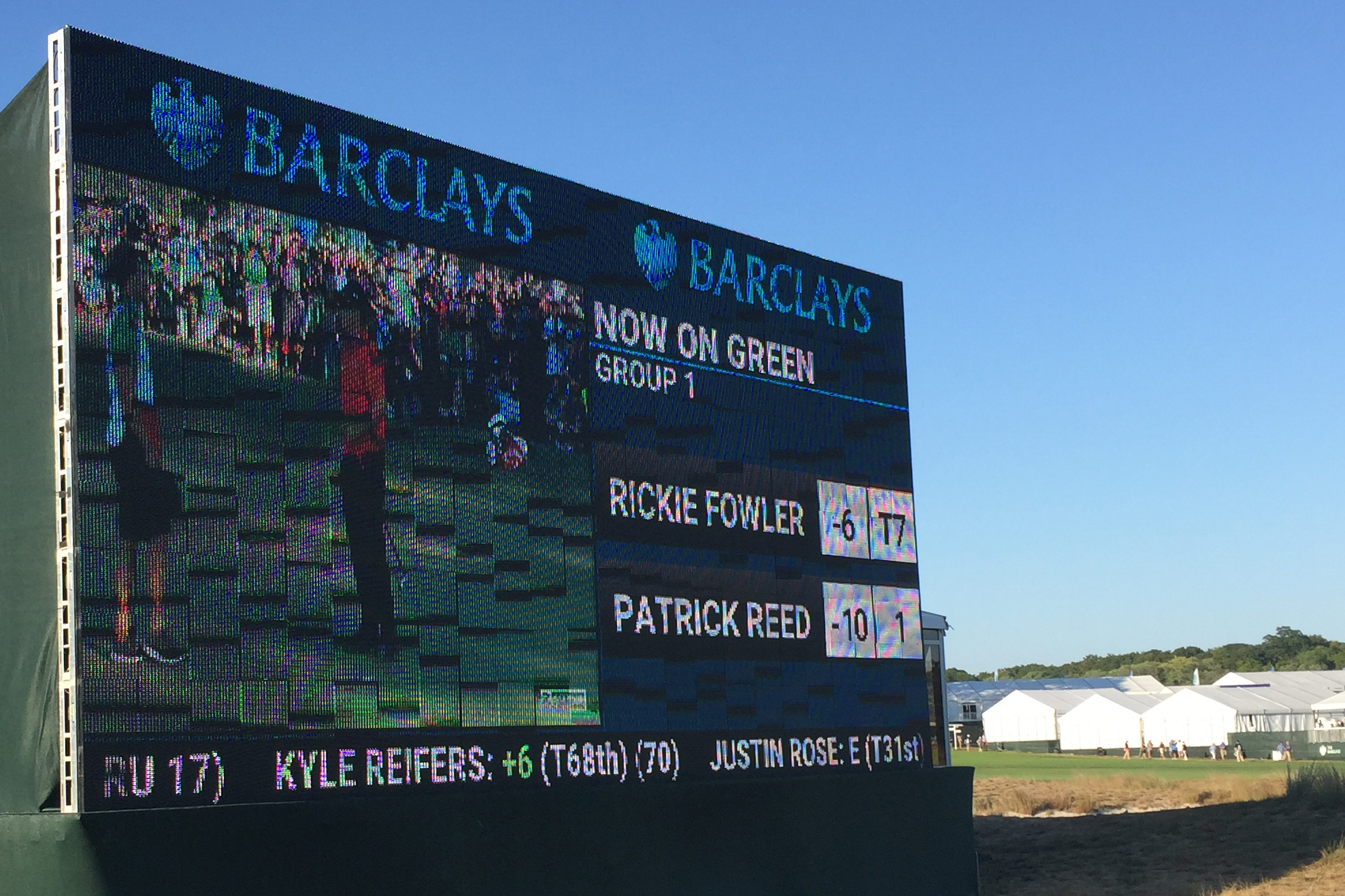 The 18th green at the moment Reed putt for bogey to win by one shot: