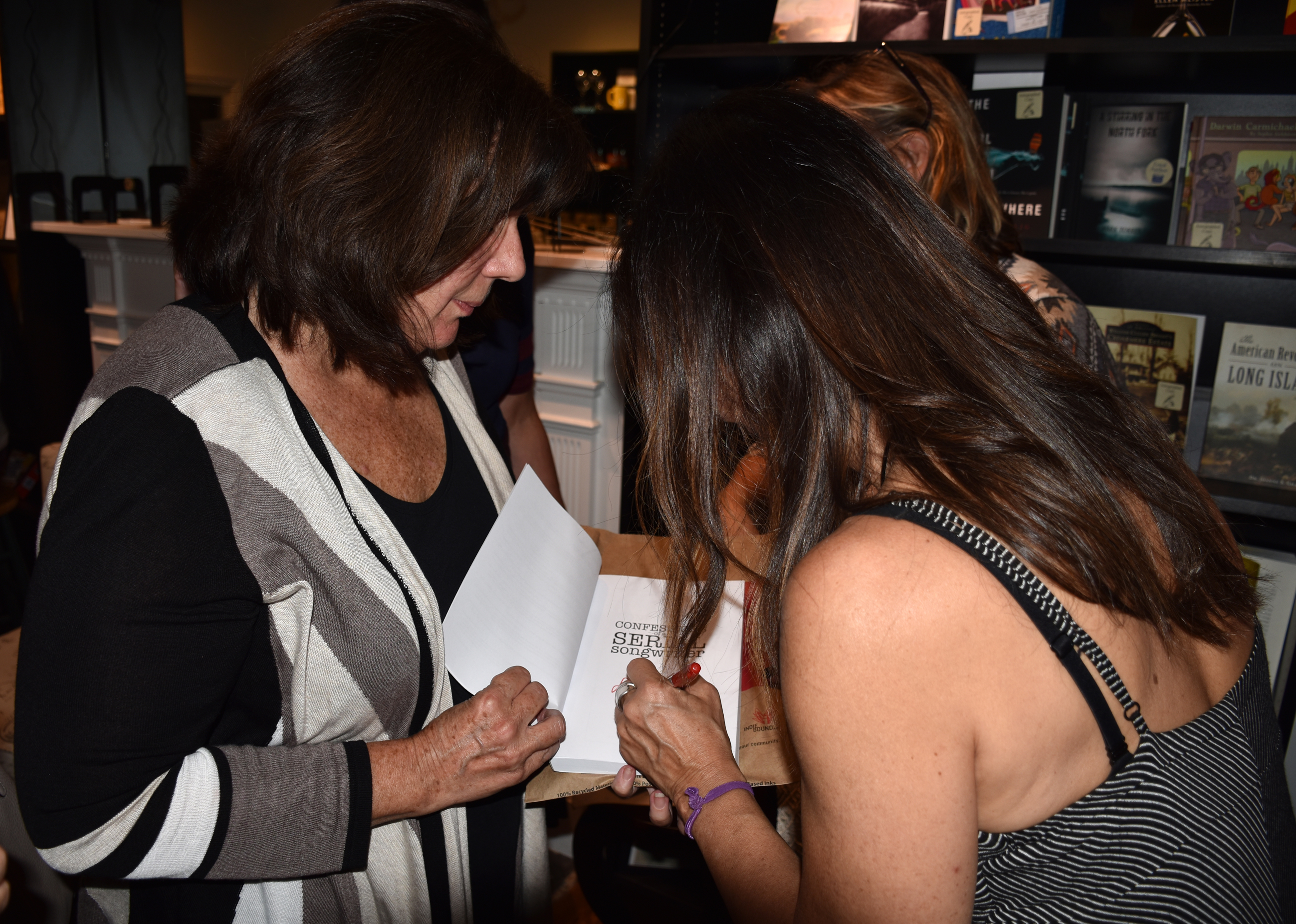 Back in March, I wrote about my experience reading songwriter and Freeport native Shelly Peiken‘s (“PIE-kin”) book, Confessions of a Serial Songwriter. I was hoping for an opportunity to meet her in person the next time there was a book signing in New York City or here on Long Island. Over the summer, that opportunity came to be as Shelly invited me and her fellow Facebook friends to an event on Friday night at Turn of the Corkscrew Books & Wine in Rockville Centre, not too far from the LIRR station. I proudly committed to going, as did many other friends from her youth in Freeport. That includes my mother Lisa, who grew up within walking distance of Shelly.