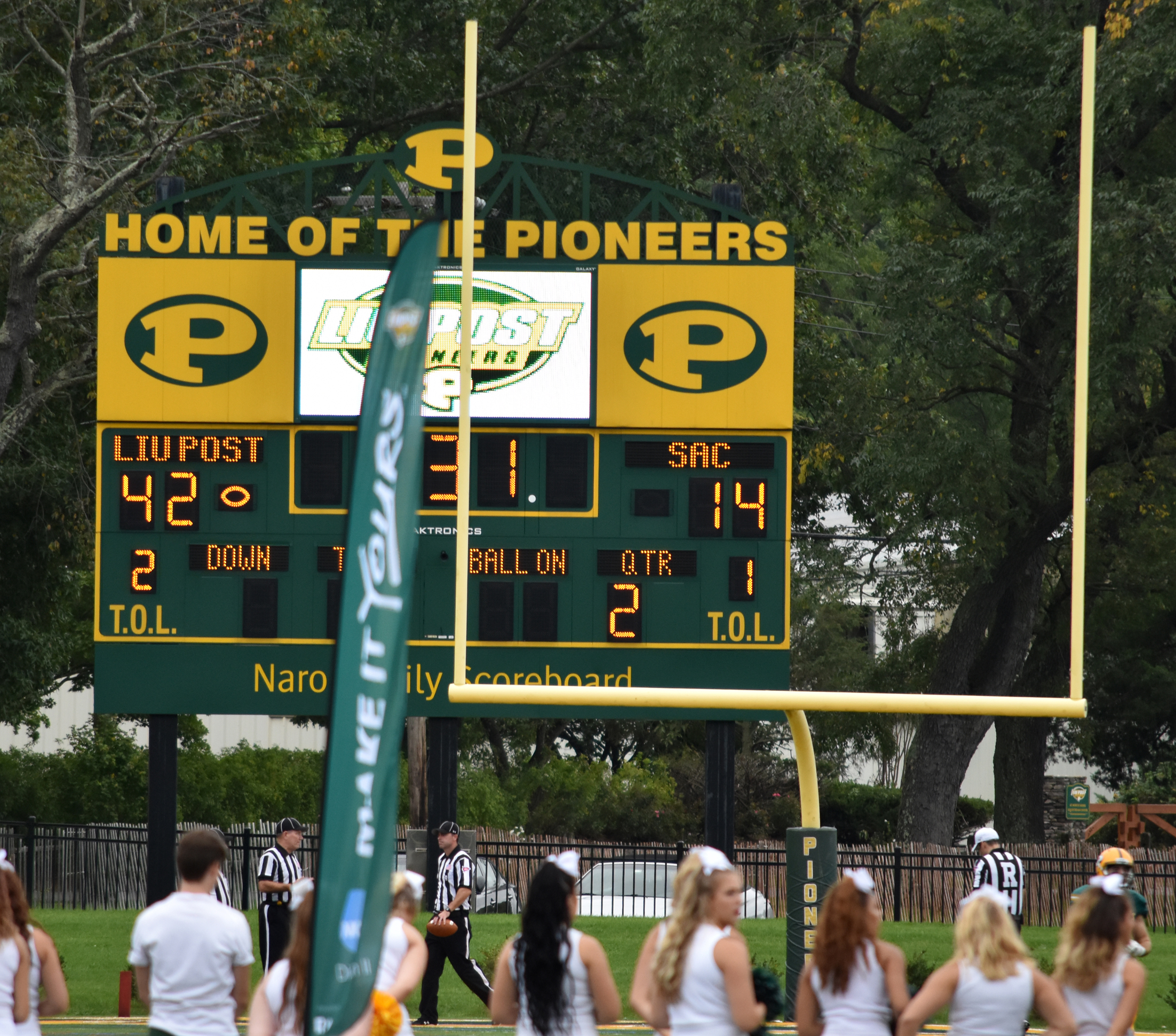 On my way to campus, I put on WCWP, whose signal wasn’t entirely clear at first, and listened to the Post Pioneers‘ Homecoming game against the Saint Anselm Hawks. The game had begun moments earlier and it was already 14-0! As my mother turned toward the Abrams Communications Building, where WCWP is located, the Pioneers scored their third touchdown to go ahead 21-0.