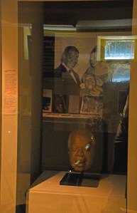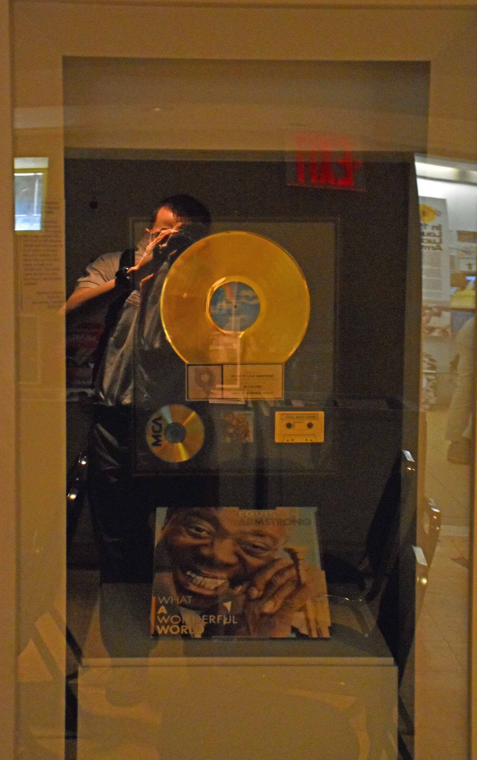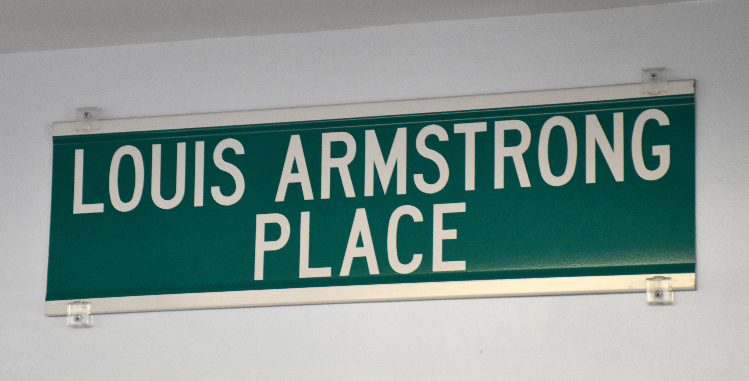 The tour headed upstairs where the aforementioned bedroom and recording room were located. The bedroom had a double-size bed with drawers on either side, paintings of scenery hanging on the walls, Mylar wallpaper, a lamp, and a chandelier. The Mylar wallpaper carried into the spacious bathroom and closet. The recording room had reel-to-reel tape decks, amps, a record player, radio, shelves of records and tapes, a desk, and a portrait of Louis painted by his friend Tony Bennett. Bennett signed it with his real surname: Benedetto. Actually, the tapes and records are housed at Queens College, but will move to the Education Center that is going to be constructed across the street from Louis’s house.