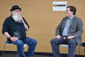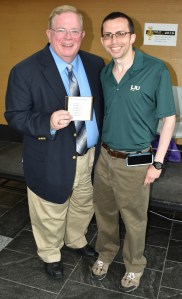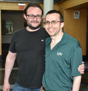 Like last year, I arrived at Tilles a half hour before the ceremony. I immediately mingled with all that had gathered in the atrium as I set up my equipment. I noticed there was a mixer behind the platform where the interviews would take place. I went to the Abrams Communications Building, the home of WCWP, to ask Director of Broadcasting Dan Cox if he had an 1/8″ to 1/4″ cable so I could record from the mixer to my TASCAM DR-03. He had a 1/8″ cable and an adapter, so I was set. When I got back to the atrium, I connected the cable and adapter to a line out jack, checked the levels, and started recording.