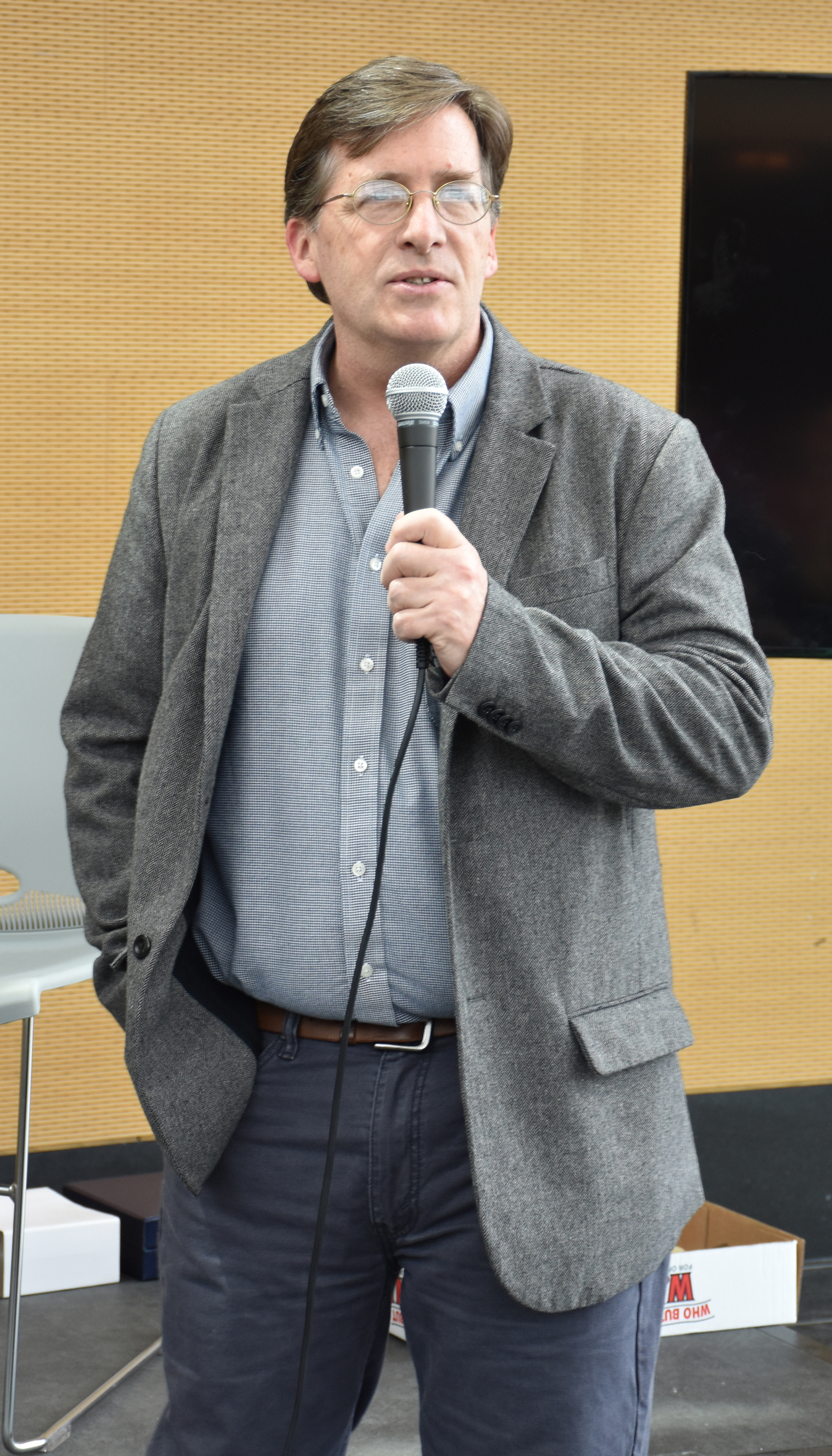 Like last year, I arrived at Tilles a half hour before the ceremony. I immediately mingled with all that had gathered in the atrium as I set up my equipment. I noticed there was a mixer behind the platform where the interviews would take place. I went to the Abrams Communications Building, the home of WCWP, to ask Director of Broadcasting Dan Cox if he had an 1/8″ to 1/4″ cable so I could record from the mixer to my TASCAM DR-03. He had a 1/8″ cable and an adapter, so I was set. When I got back to the atrium, I connected the cable and adapter to a line out jack, checked the levels, and started recording.