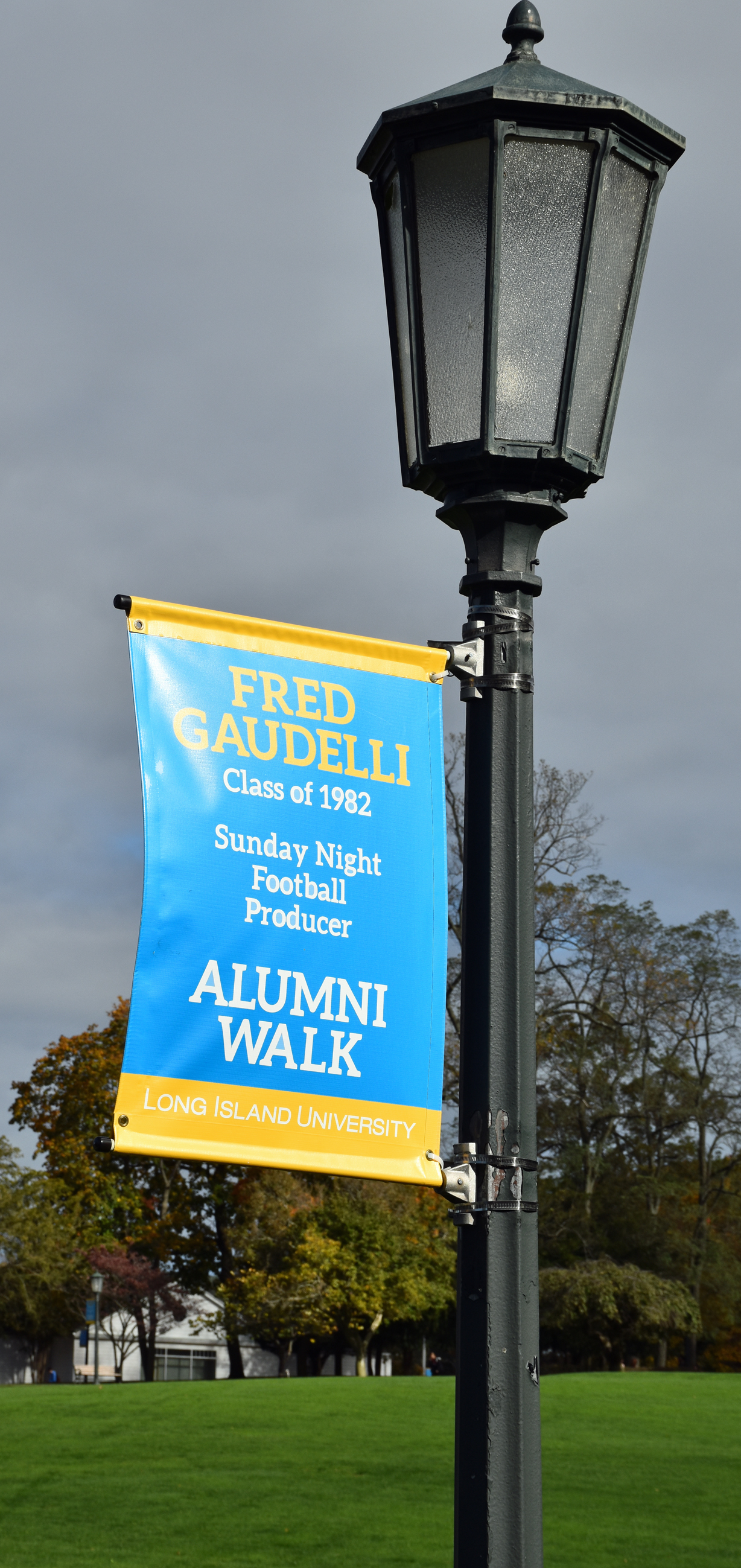 Ryan’s next task was going to the bursar to update his alumni contact information. So, we walked north to Kumble Hall, passing signs with alumni names on them. One of them was Fred Gaudelli: