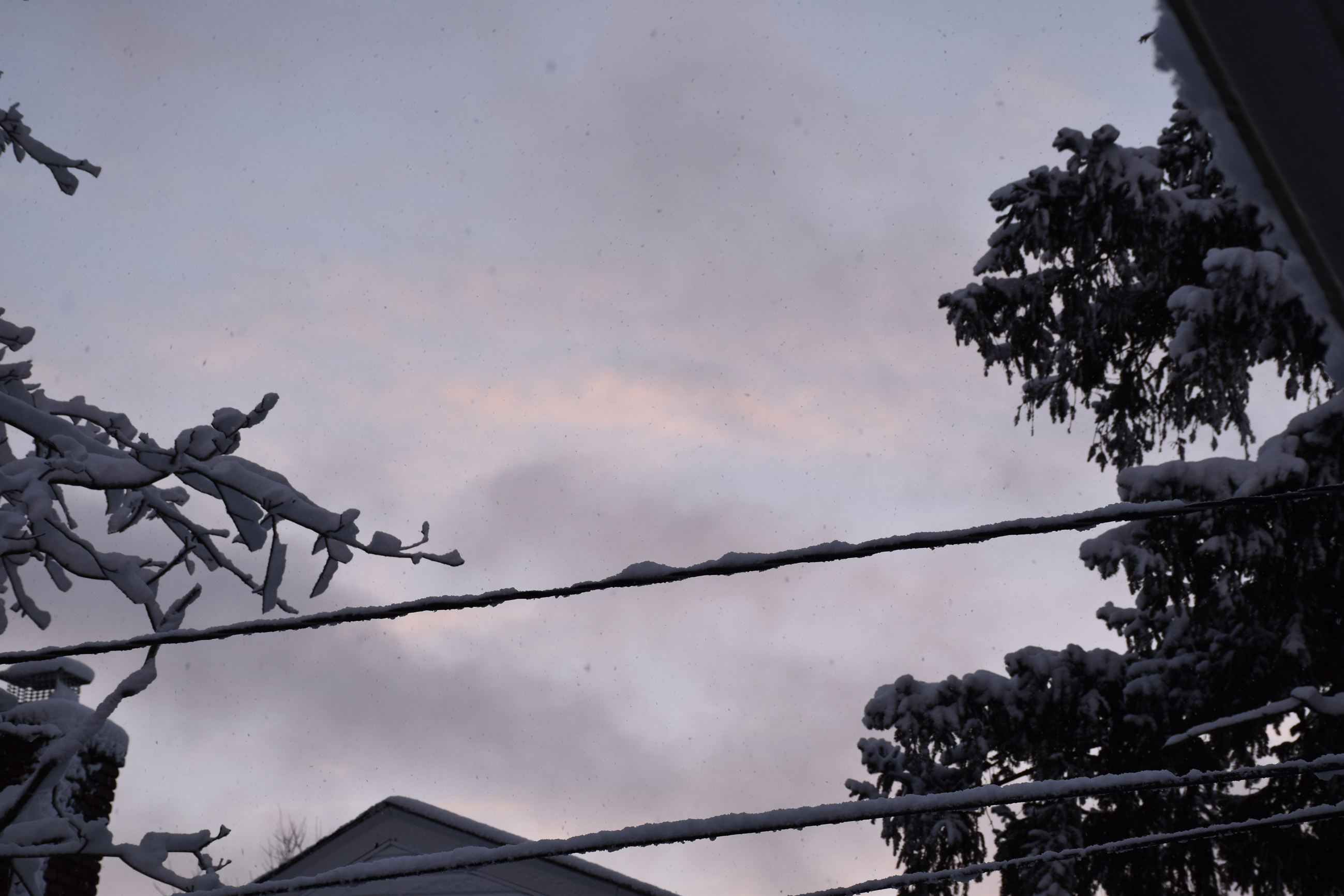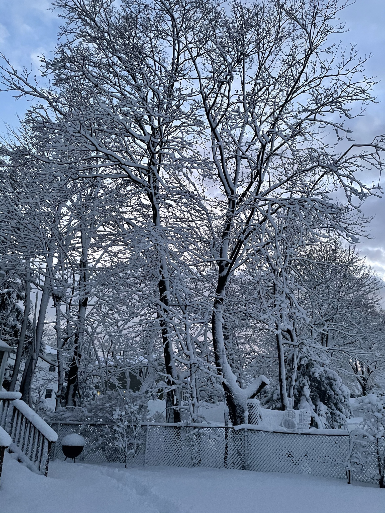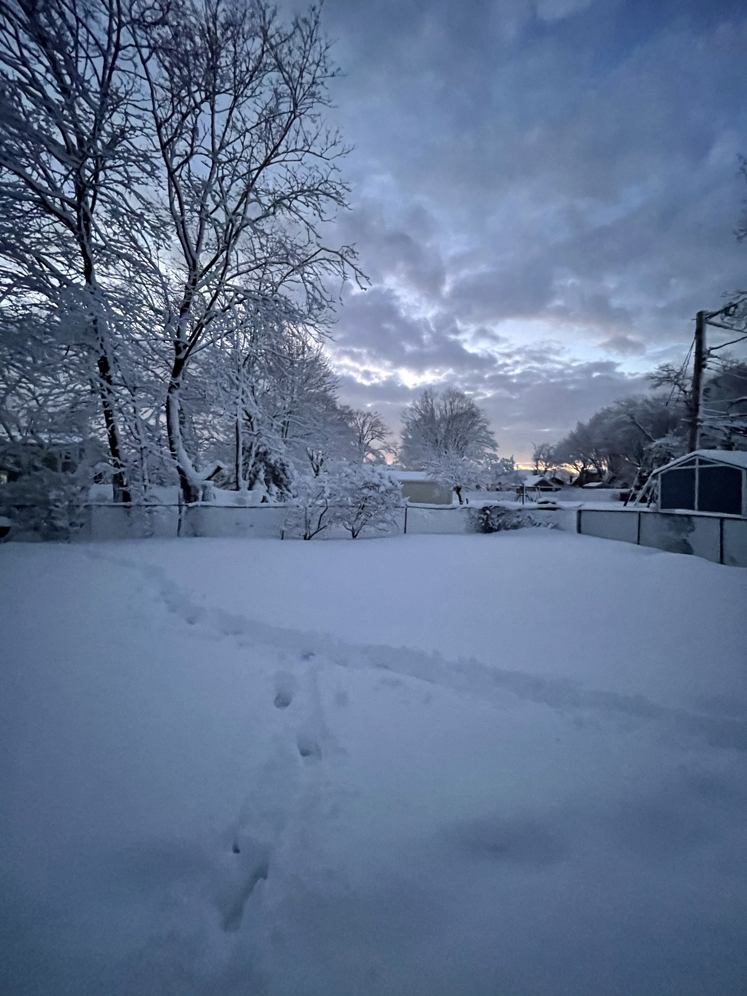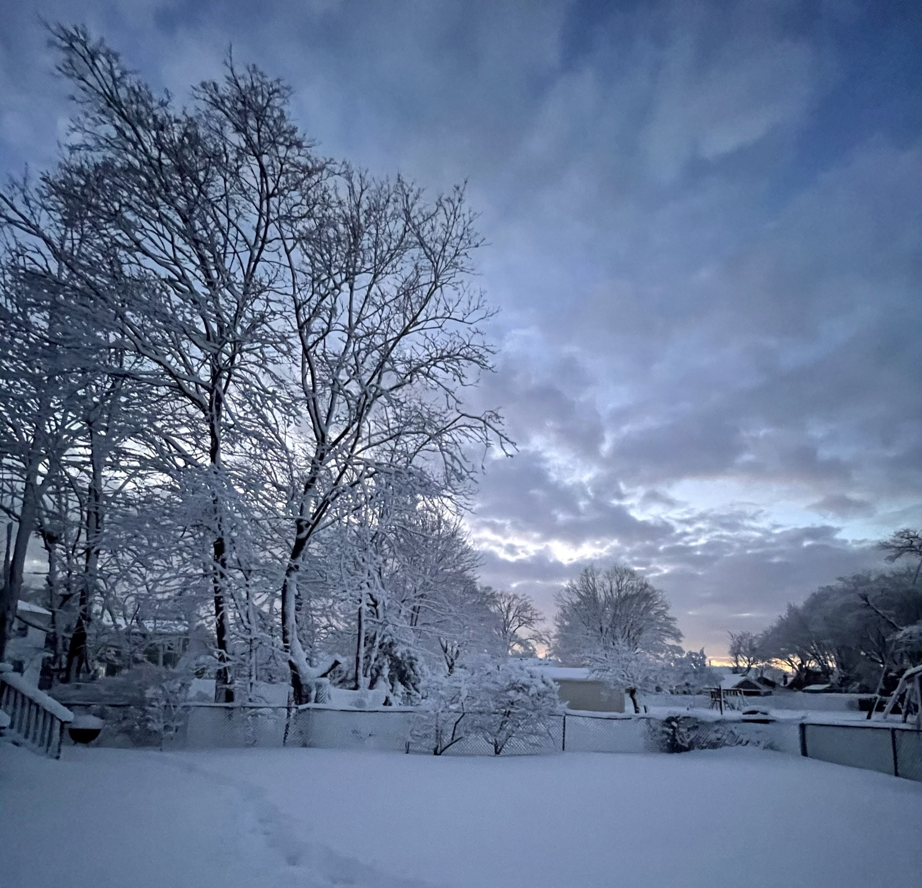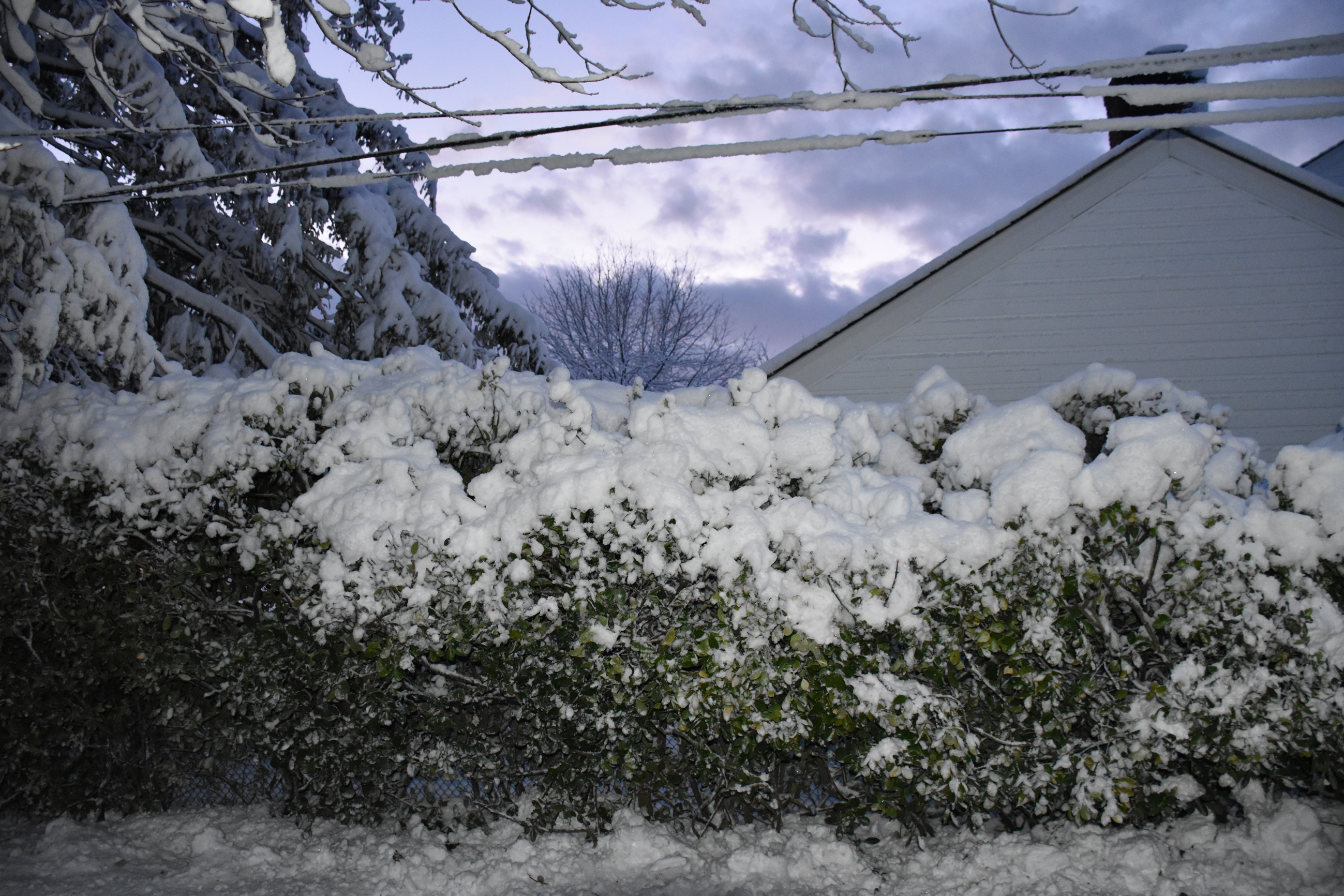 My dad Bill took these backyard photos from the back door at 4:54 while the snow was winding down: