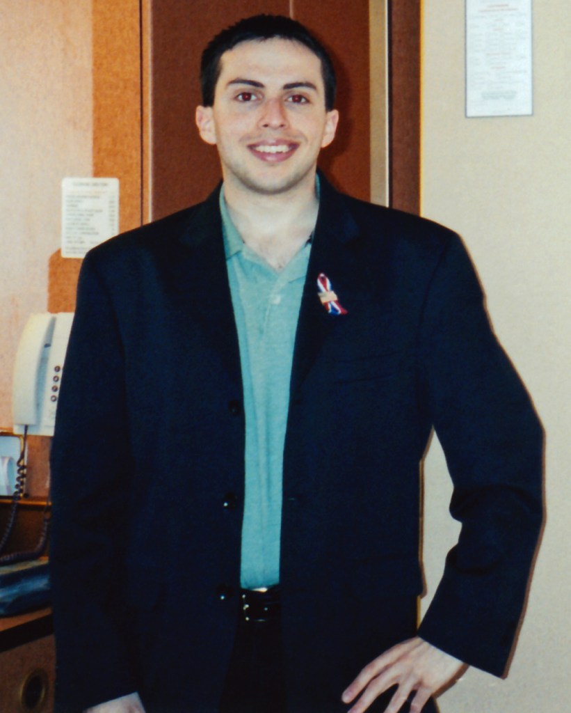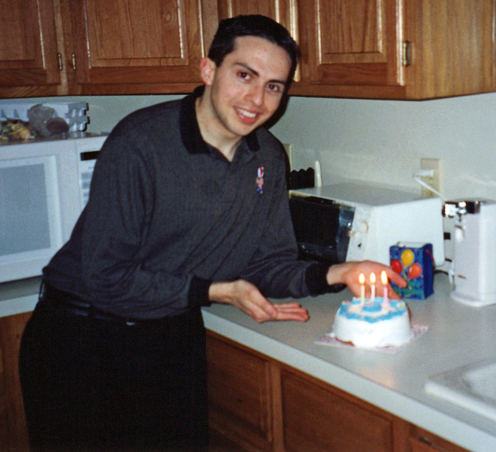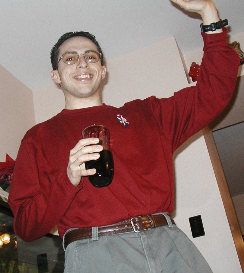 There were increased expressions of patriotism after 9/11, including flying American flags outside homes and wearing American flag lapel pins. We flew a flag and, for about two years, I wore a lapel pin, usually with a red, white, and blue ribbon attached. For a while, I also wore a patriotic button, but I don’t remember what it said. Here are photographic examples, starting with my friend Joe Horst’s 20th birthday party on October 3, 22 days later: