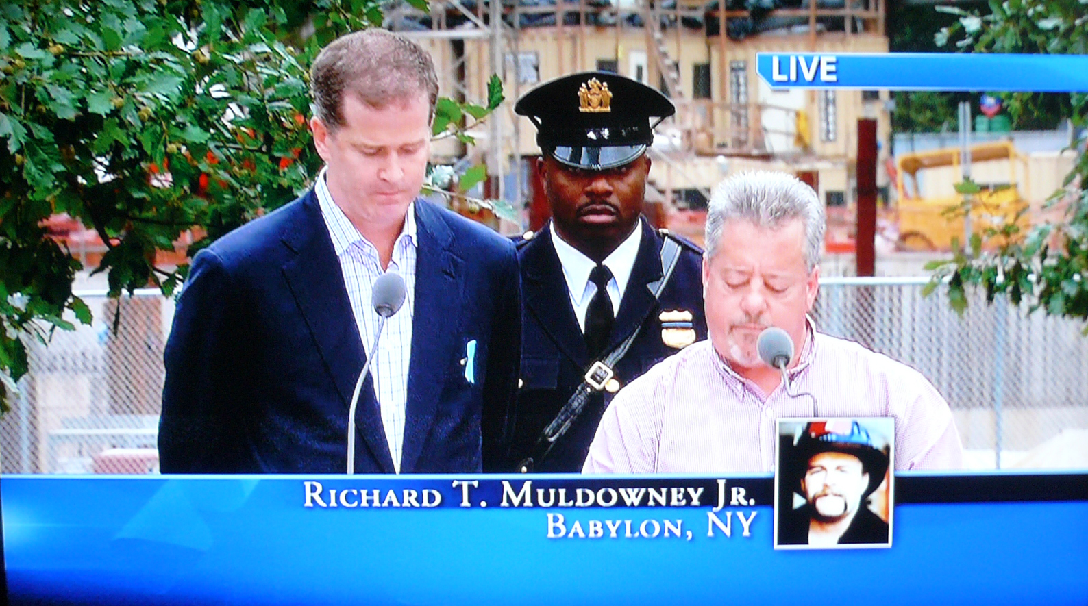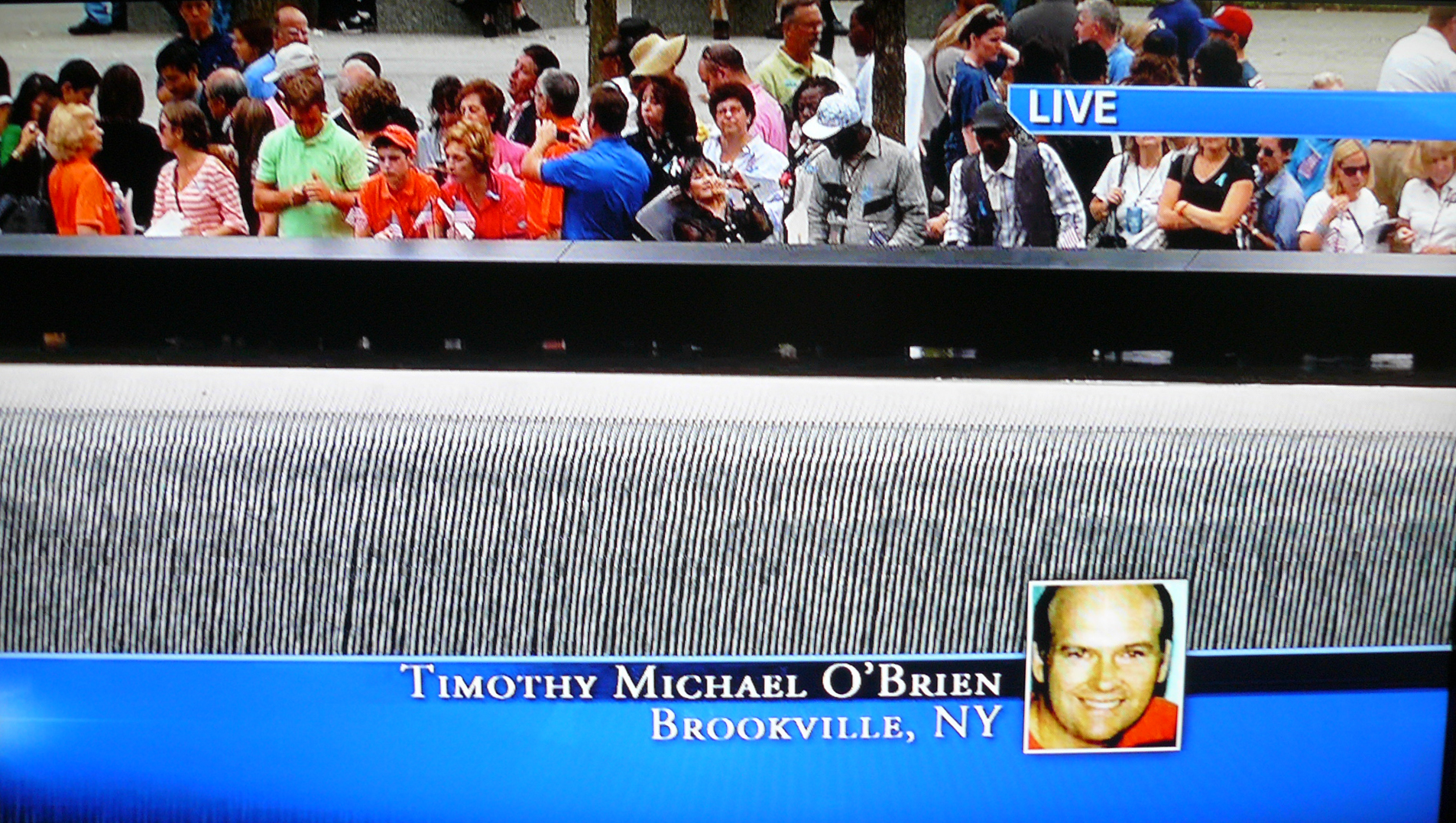I did not know any of the victims personally, but Cynthia D’Arpino, my learning assistant in ARC (C.W. Post’s Academic Resource Center), lost her brother-in-law Tim O’Brien who worked for Cantor Fitzgerald. On the tenth anniversary, I photographed the TV when his name was read: