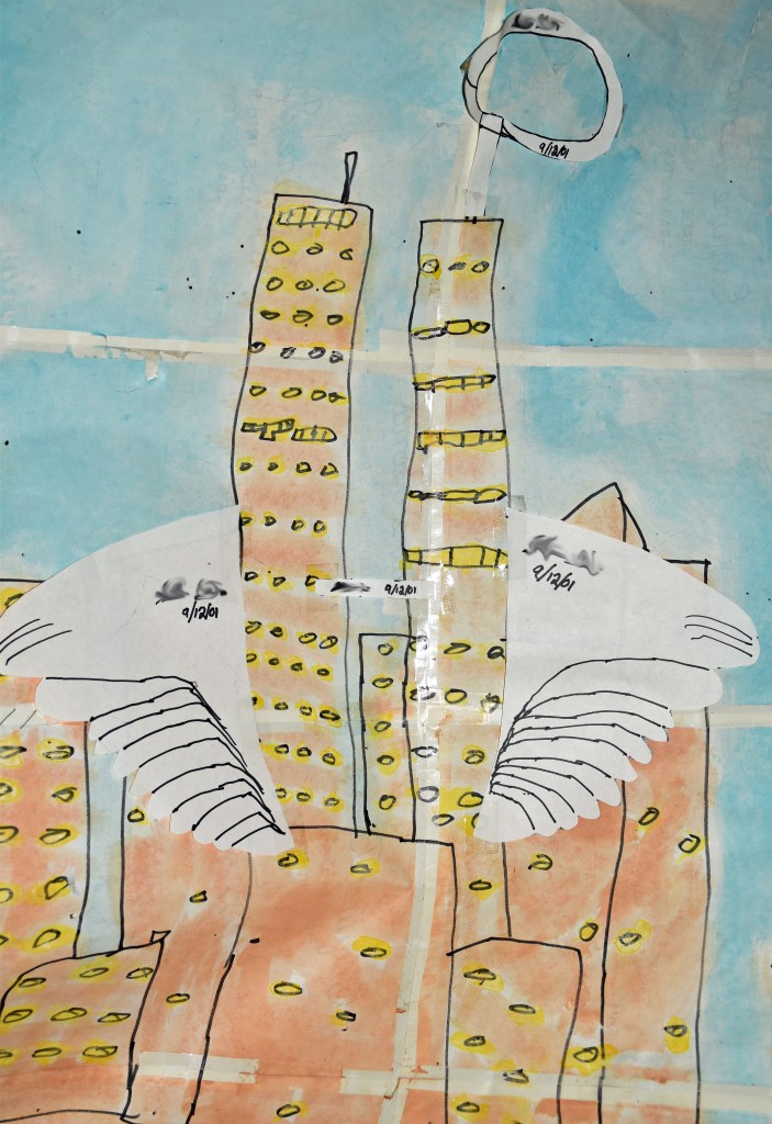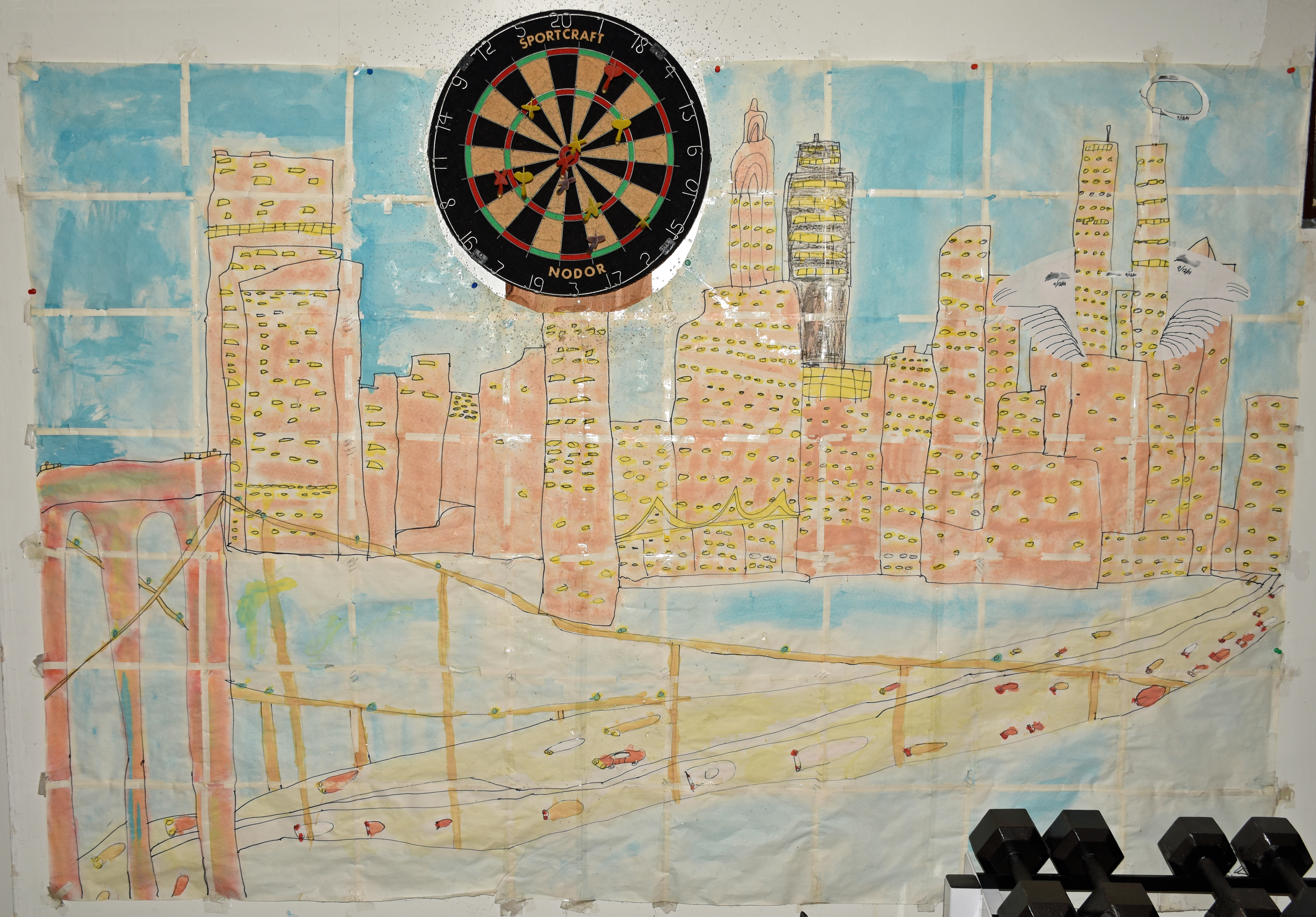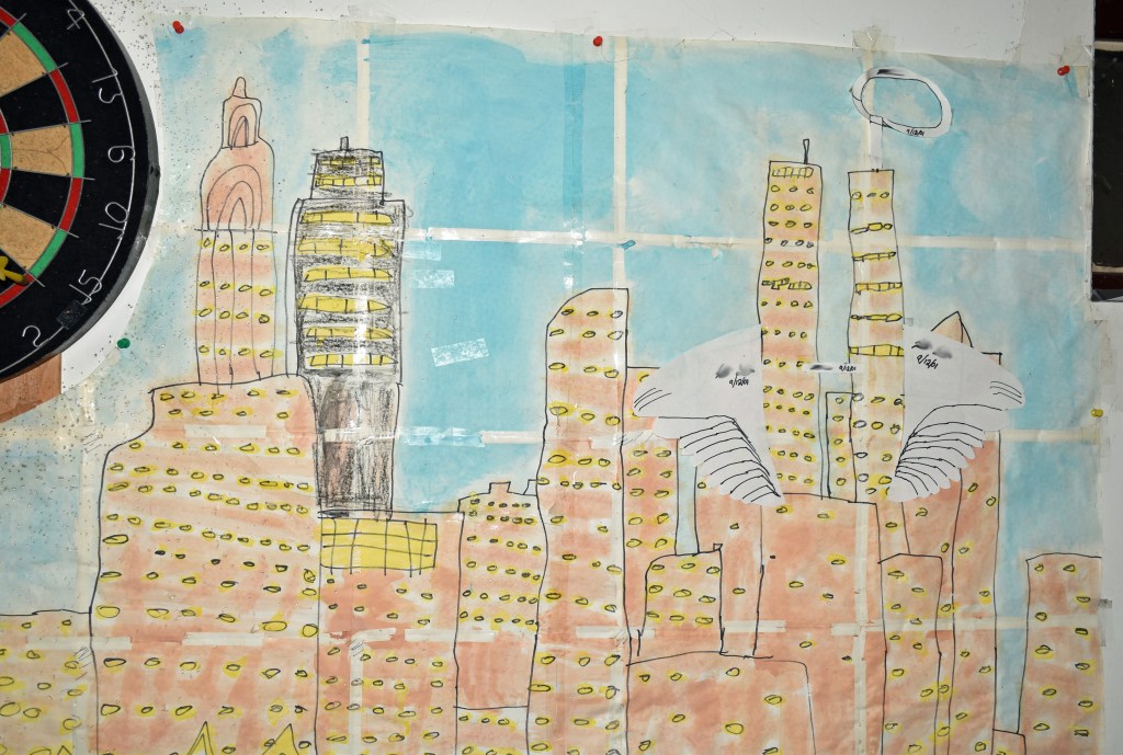 On September 12, 2001, I added angel wings and a halo to the twin towers portion of a backdrop I made five years earlier for a home video/audio show I did with my cousin – The Chris and Mike Chimeri Show – based on a video bumper for The Late Show with David Letterman. I kept the backdrop up until September 30, 2019, during a basement cleanup. I photographed the backdrop for posterity before taking it down (for privacy, I’ve blurred my signature):