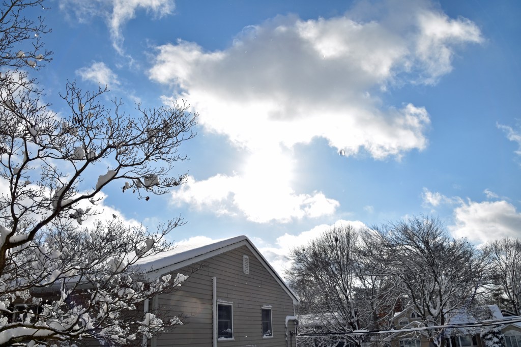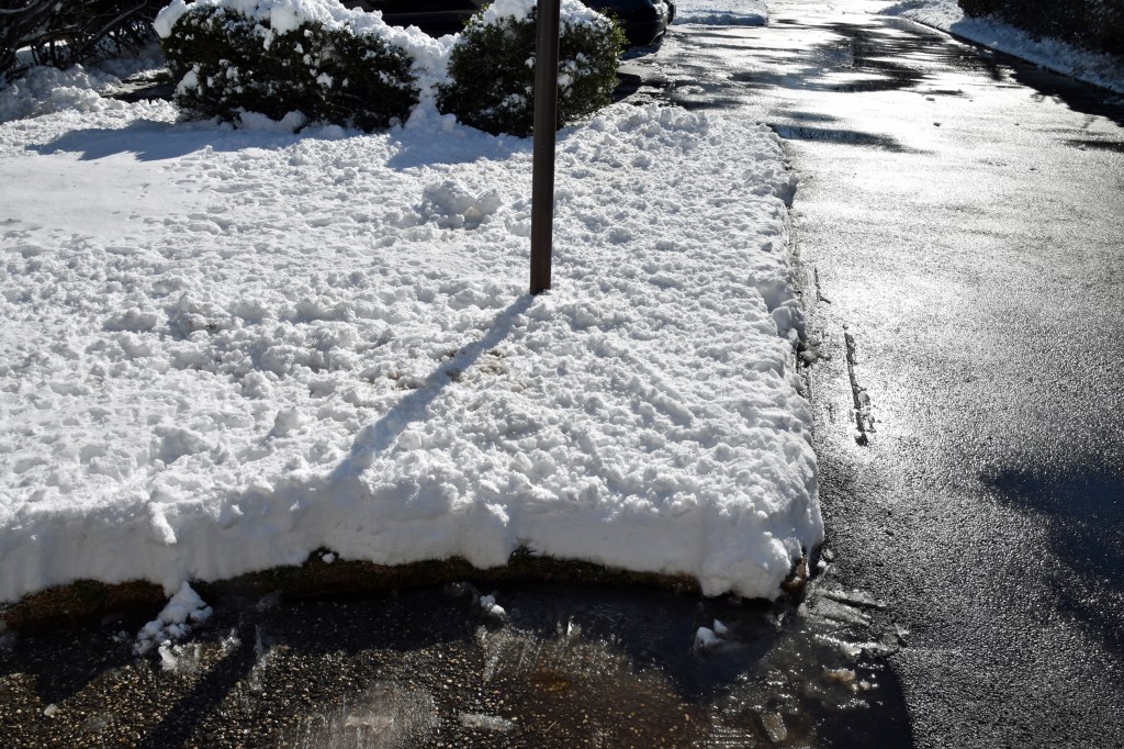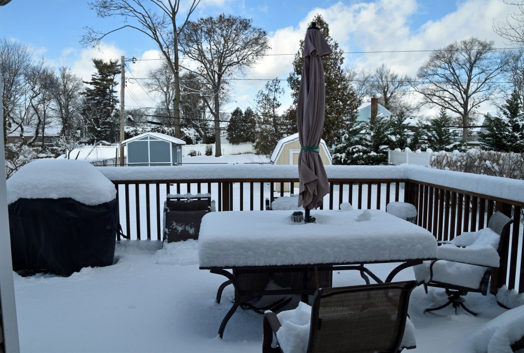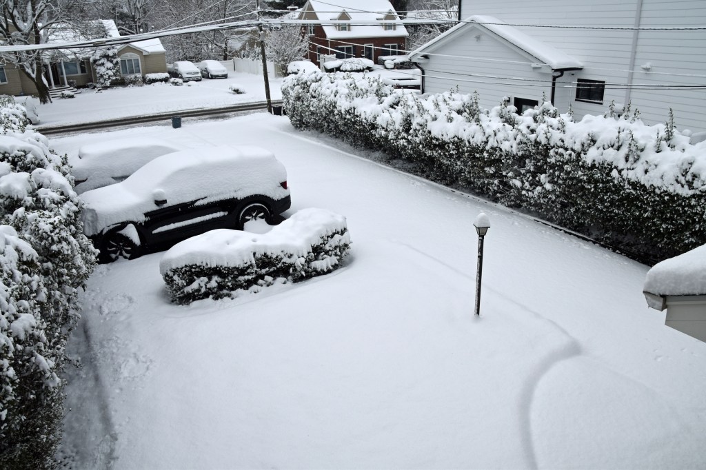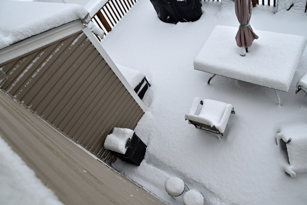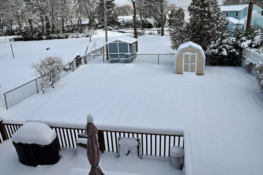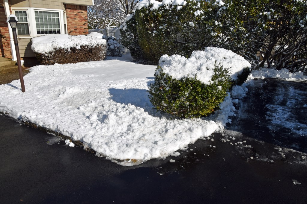 The initial forecast earlier in the week called for a rain/snow mix, but I’ve learned to expect a colder and snowier forecast as the event approaches. That’s what happened here. Thursday’s winter weather advisory called for 3 to 5 inches, then 2 to 4. 8 inches fell (one less than five years ago), at least on our lawn. I measured 5 inches in the driveway, which was resurfaced in August. With air temperatures around the freezing mark (32 degrees Fahrenheit), snow was more wet than powdery, at least by the time I woke up. My friend Jeff Jensen noted it was powdery at the onset. Seeing snow clumped on the trees and bushes misled me.