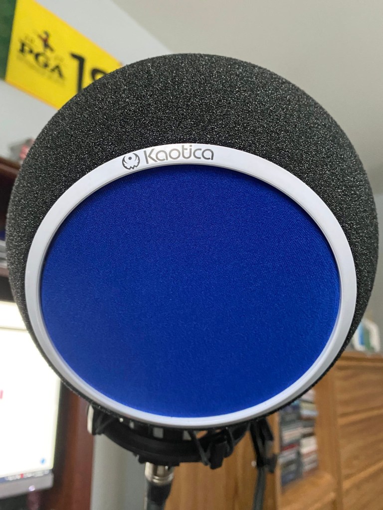 A few days before work on this show began, I finally took the plunge and bought the Kaotica Eyeball microphone isolation shield. Since my remote location has minimal room echo, the Eyeball is for home recordings. It only took two days to ship from Calgary, Alberta, Canada. Here’s how it looks from my chair: