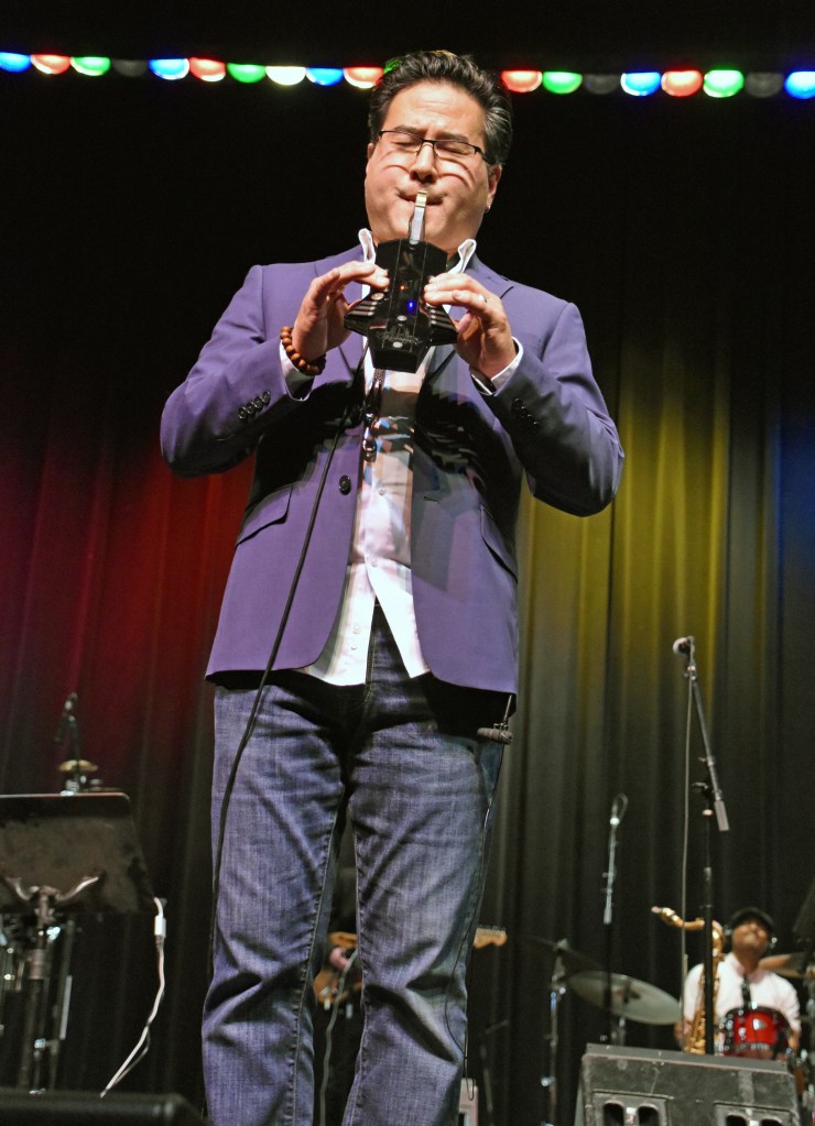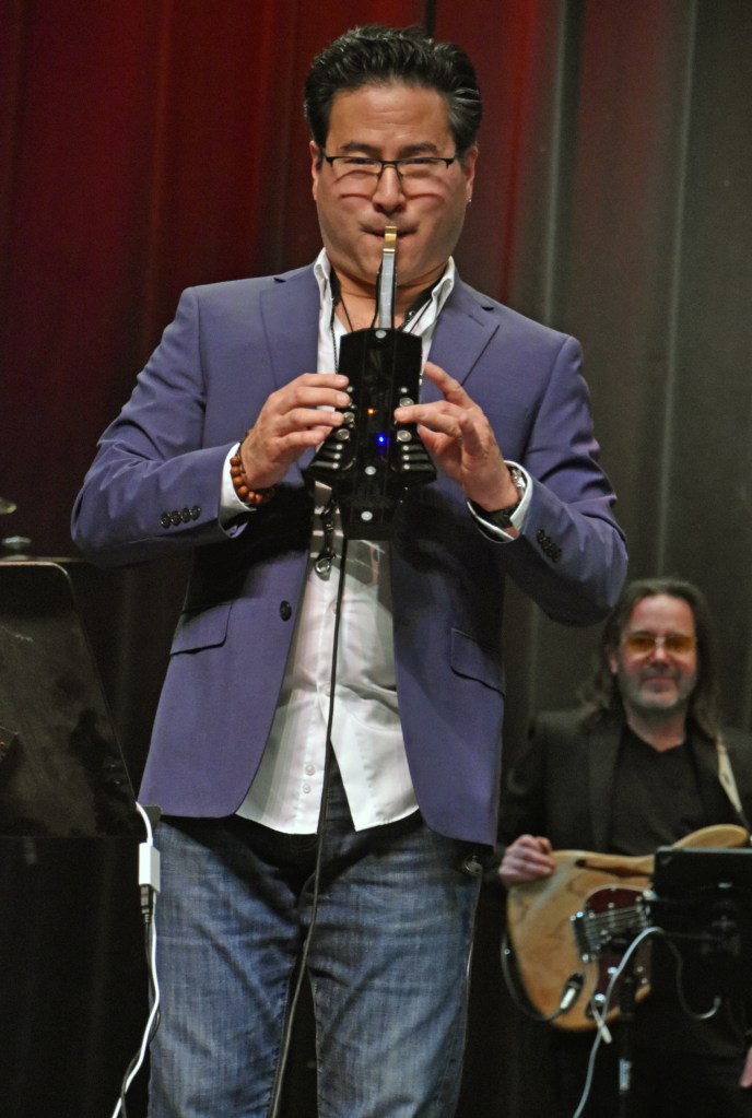 The NuRAD is an EWI (electronic wind instrument) that can be paired with a phone or tablet. Jeff paired his with his phone. 5/9 UPDATE: Jeff said in a Facebook post sharing one of my photos that it was “triggering [his] iPhone with the Korg iMono/Poly Patchman library.”