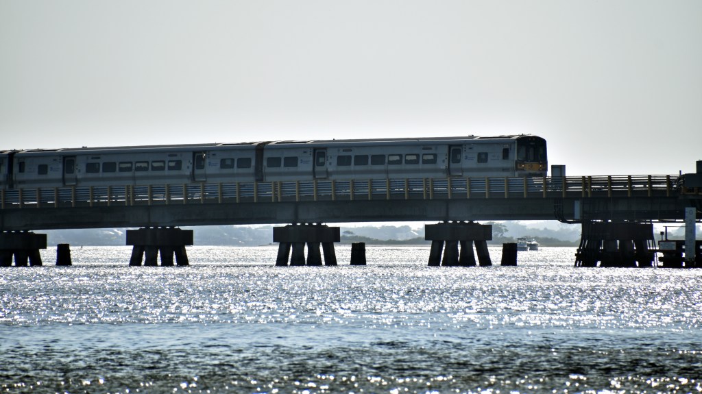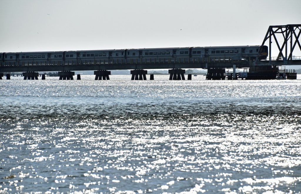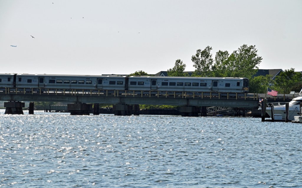 An LIRR train heading north on the Reynolds Channel Bascule Bridge