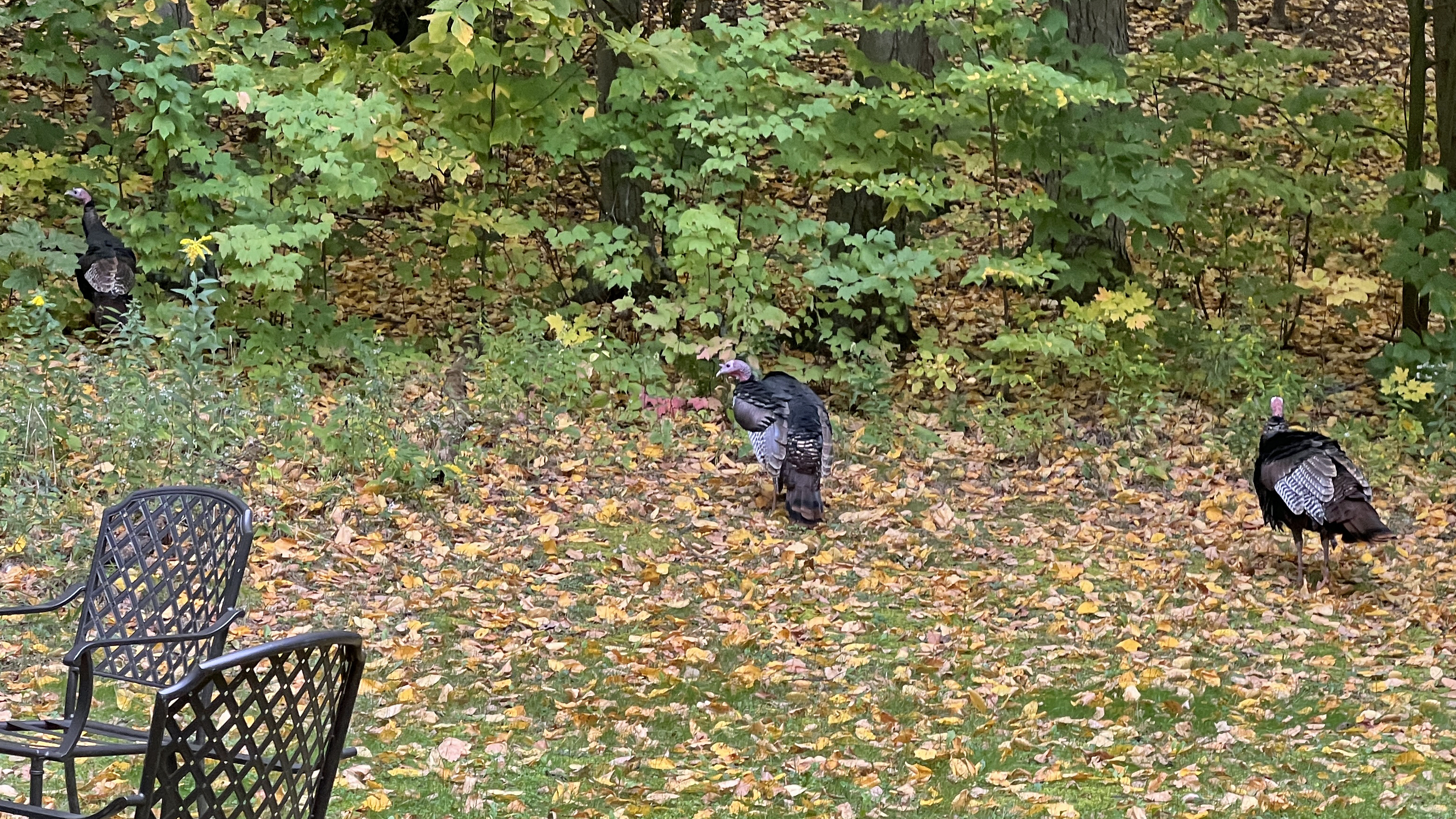 Monday morning, October 10, I spotted three wild turkeys walking through the AirBNB’s backyard. I went outside to take photos with my phone, and ended up following them several yards into the woods.