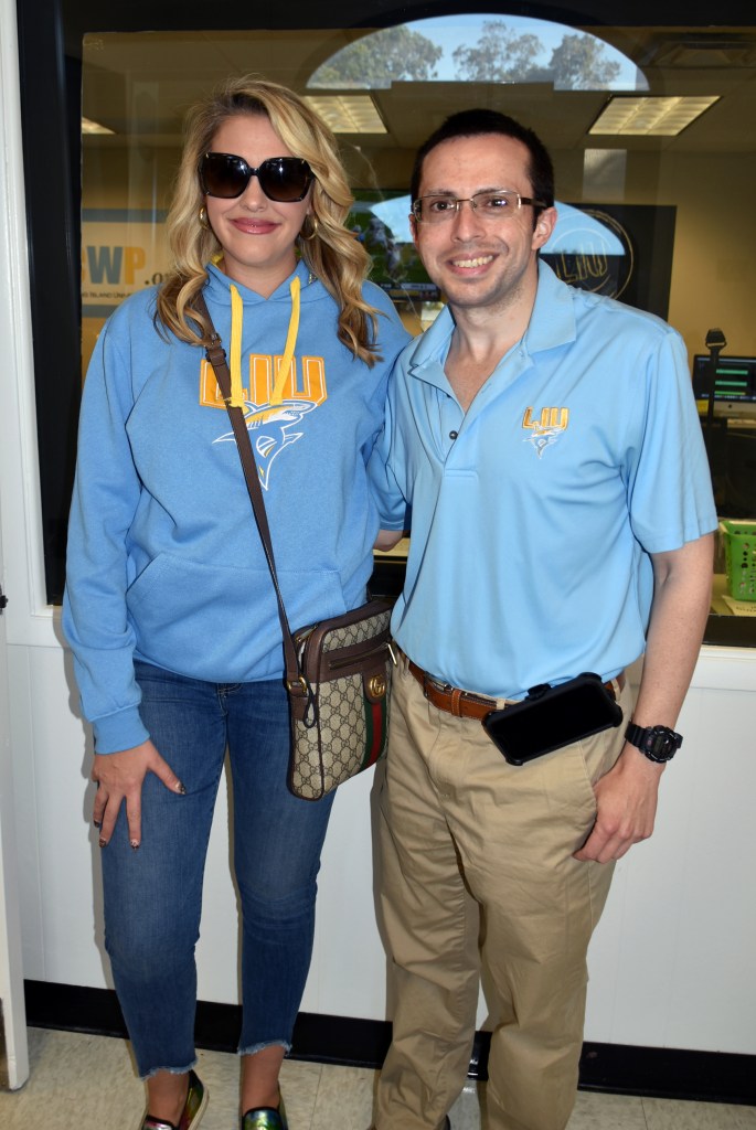 One such alum to drop by during the football game was M.J. Lonardo, known as DJ M.J. during her time at WCWP. The photo I took of her and station manager Pete Bellotti is the first in a series of two-person photos taken throughout the day: