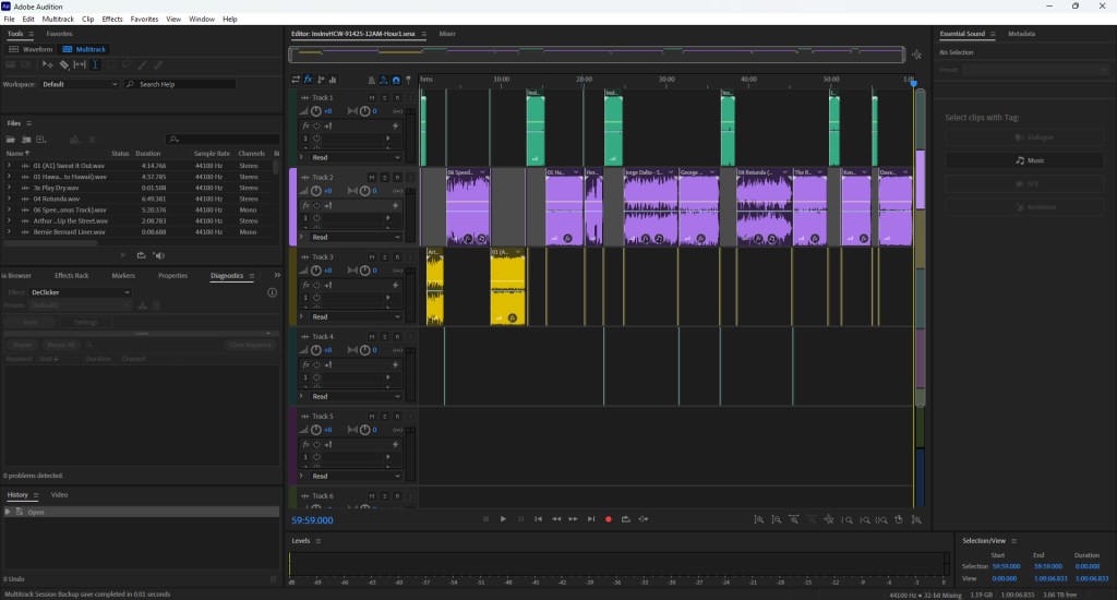 I planned on recording one hour per day – August 28 and 29 – during livestreams on my Twitch channel, just as I had done for last year’s prerecord and the final regular Instrumental Invasion. To save time during the streams, I prepared the Adobe Audition multitrack sessions for each hour on August 25. That’s when I realized I’d made a timing error for both hours! I was four minutes over in hour 1 and two minutes under in hour 2. So, I had to make further tweaks to the playlist, annotations, and script with different songs to make up for the oversights.