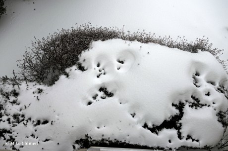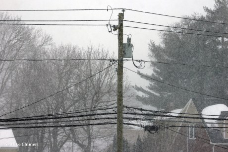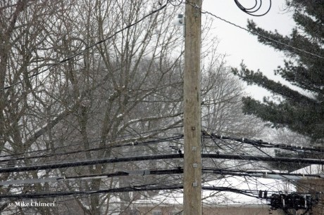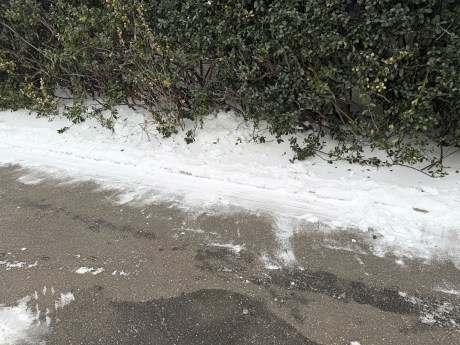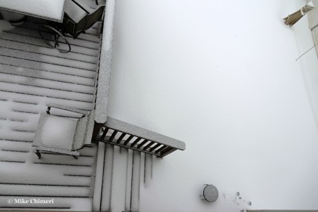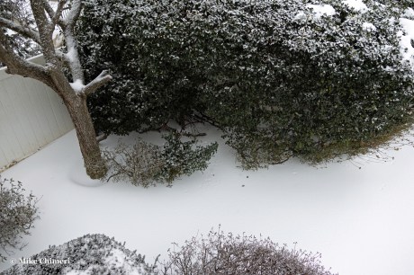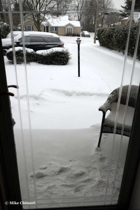 Snow was reportedly still mixing in with the sleet, but I couldn’t tell. Either way, I wore earplugs to bed to drown out the sleet pelting my east-facing window. All the photos you’ve seen so far are from my south-facing window. At one point when my dad noticed that window was closed, he intentionally aimed the snow blower chute in that direction, sending a blast of snow my way. As he later told me, he wouldn’t have done that if he saw me camera in hand with the window open.