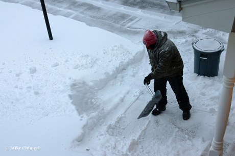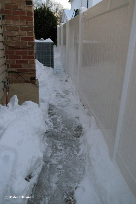 I was physically drained. Not only did I have to shovel, but scraping and chiseling were also involved thanks to the sleet mixture. The left side of the house was the easiest (least difficult) to shovel because it was untouched.