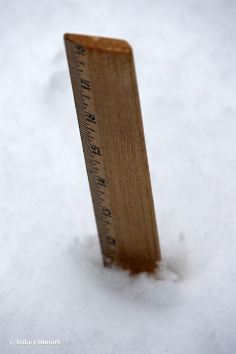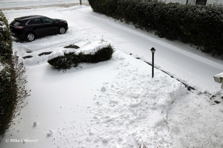 Less than an hour later, I prepped to go outside and shovel. Once I was properly dressed at 8:33 AM, I measured the snow and sleet with an 18-inch ruler from an untouched spot on the front lawn, and took a before photo on the front porch.