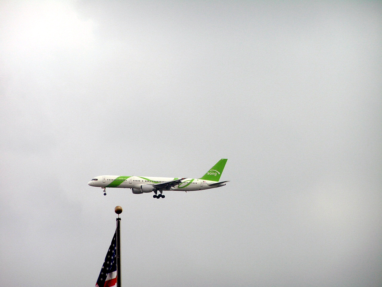 A plane for a since-defunct airline in its final approach to LaGuardia Airport:
