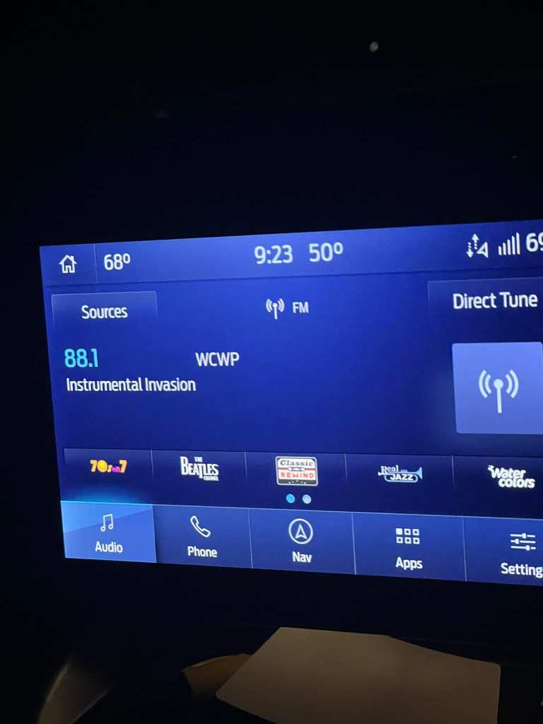 The April 26 Instrumental Invasion on WCWP went on the air at the end of the station dinner for students and alumni. The dinner was held at The View Grill, located off Long Island Sound in Glen Cove. I listened to much of the first hour during a ride home from my parents. Mom took a photo of Dad’s infotainment system while tuned to 88.1 FM: