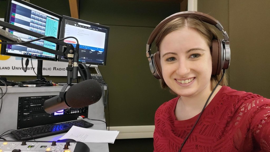 Alana next to the WCWP-FM 60th anniversary banner