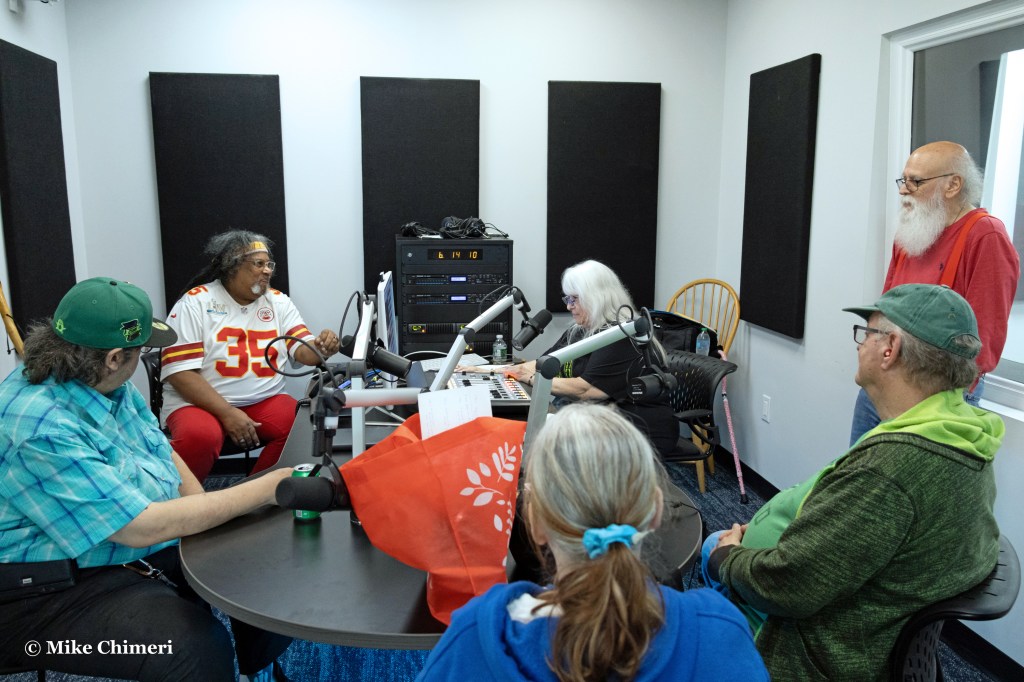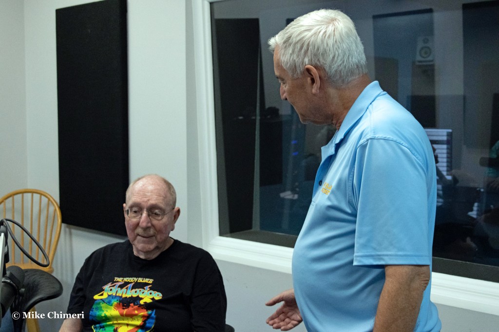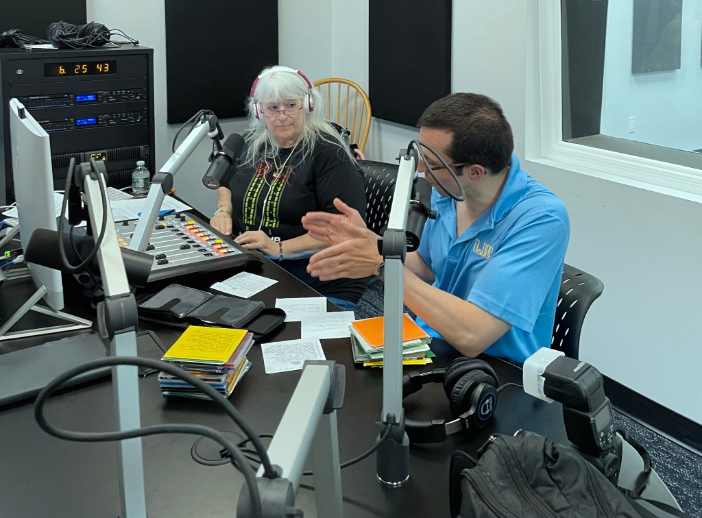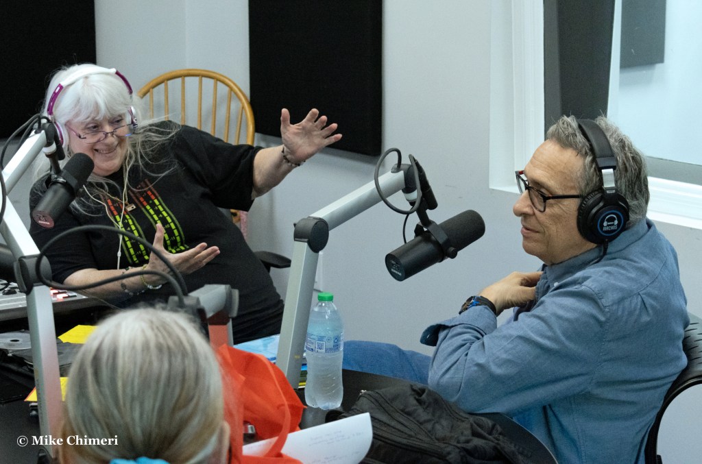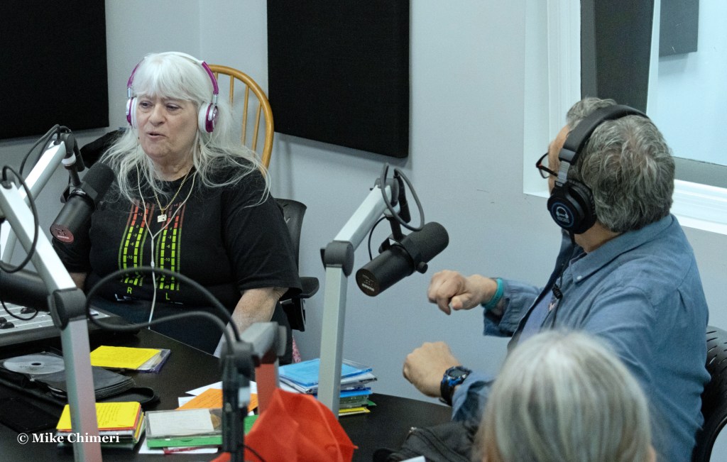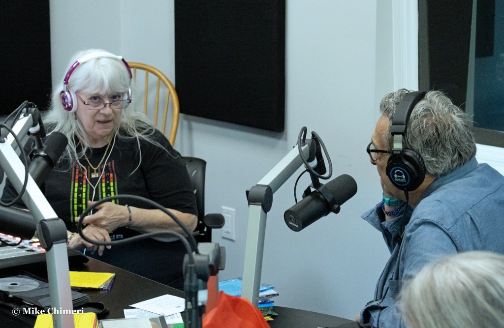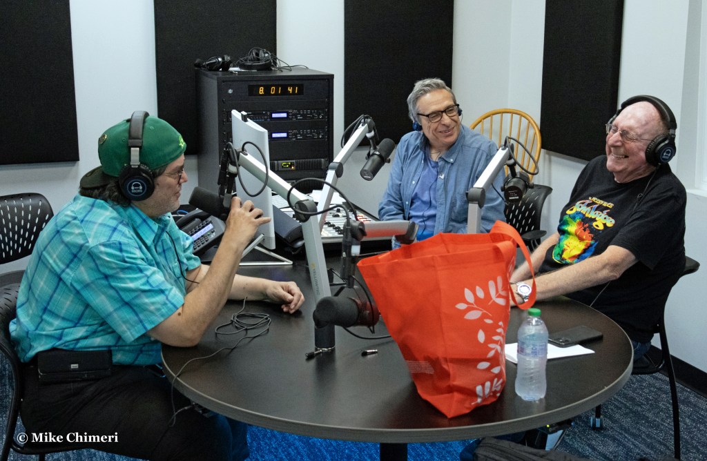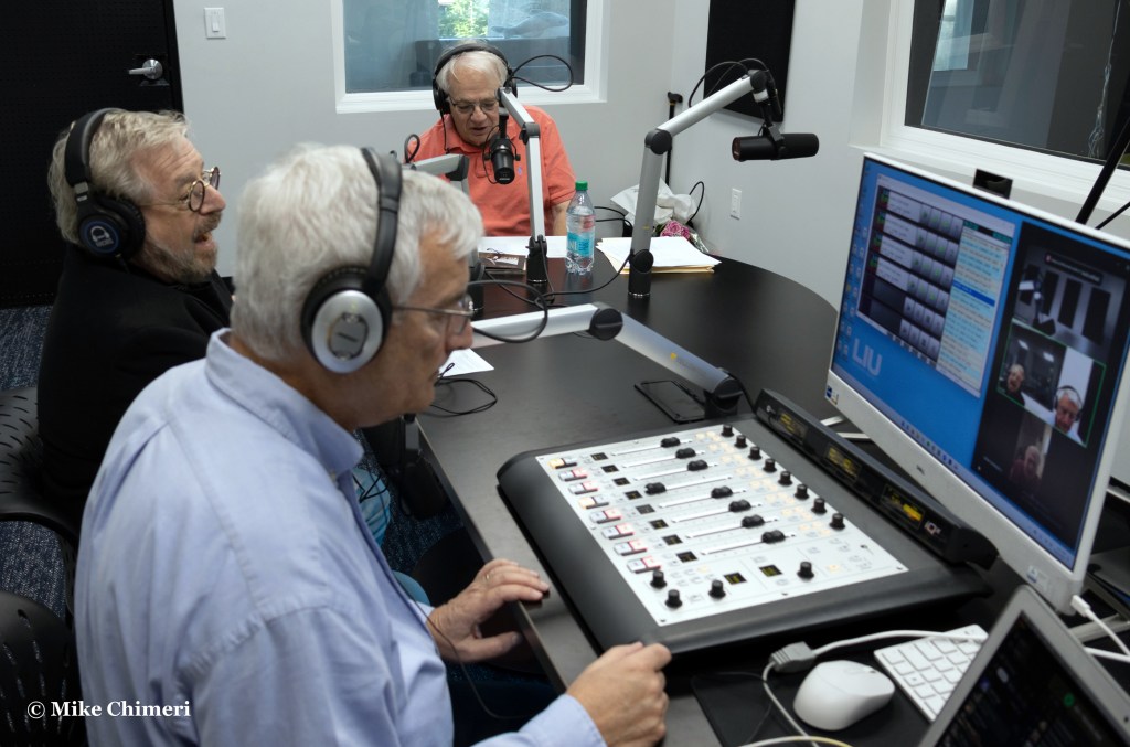 Hugh Hammill is pictured talking to WCWP station manager Dan Cox with Bernie Bernard prepping the next CD to play. Jeff Kroll is standing on the right and Bernie’s sister Melissa is seating facing away in the foreground.