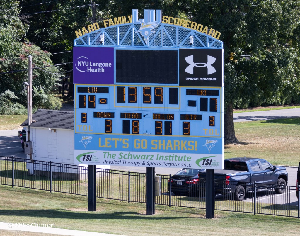 The centerpiece of the weekend was the LIU Sharks football team‘s Homecoming game (and home opener) against the Sacred Heart Pioneers. (That was the LIU Post team name before the Post and Brooklyn athletic programs merged and moved from NCAA Division II to Division I.)