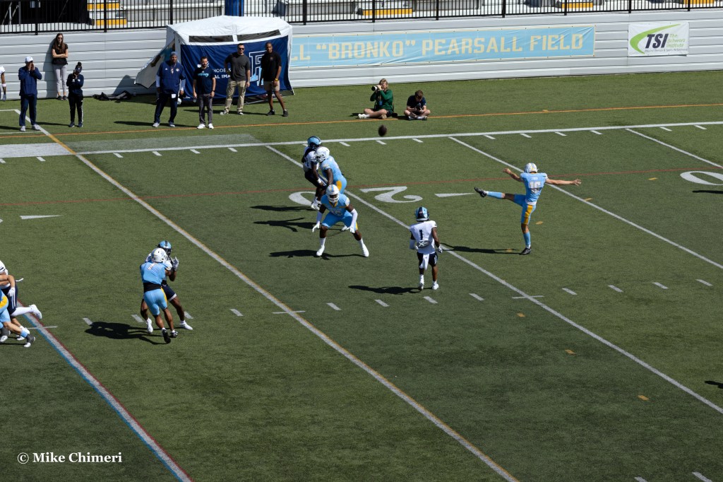 The Sharks led the Rams 21-14, but went on to lose 28-21. The key moment came late in the fourth quarter. One play after the Sharks recovered a Rams fumble at the 1-yard line, the Sharks fumbled the ball back to Rhode Island at the 5. The Rams tied, and went ahead on their next possession. At least it was an exciting game for Jeff, Neil, and Travis to call.