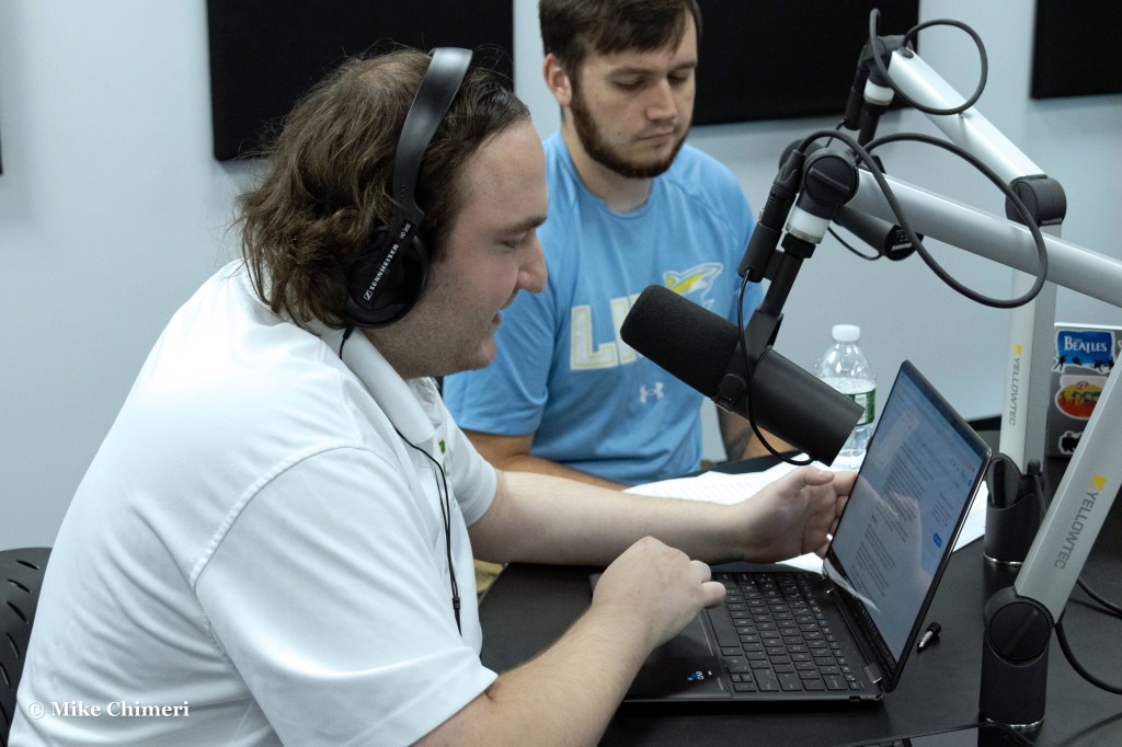 After editing what I’d airchecked so far, my mom drove me up to LIU Post half an hour later than Friday. We had to clear a security checkpoint before reaching the parking lot by WCWP. I unpacked and walked toward Shark Stadium (no naming rights this year) for photos around and above the field.