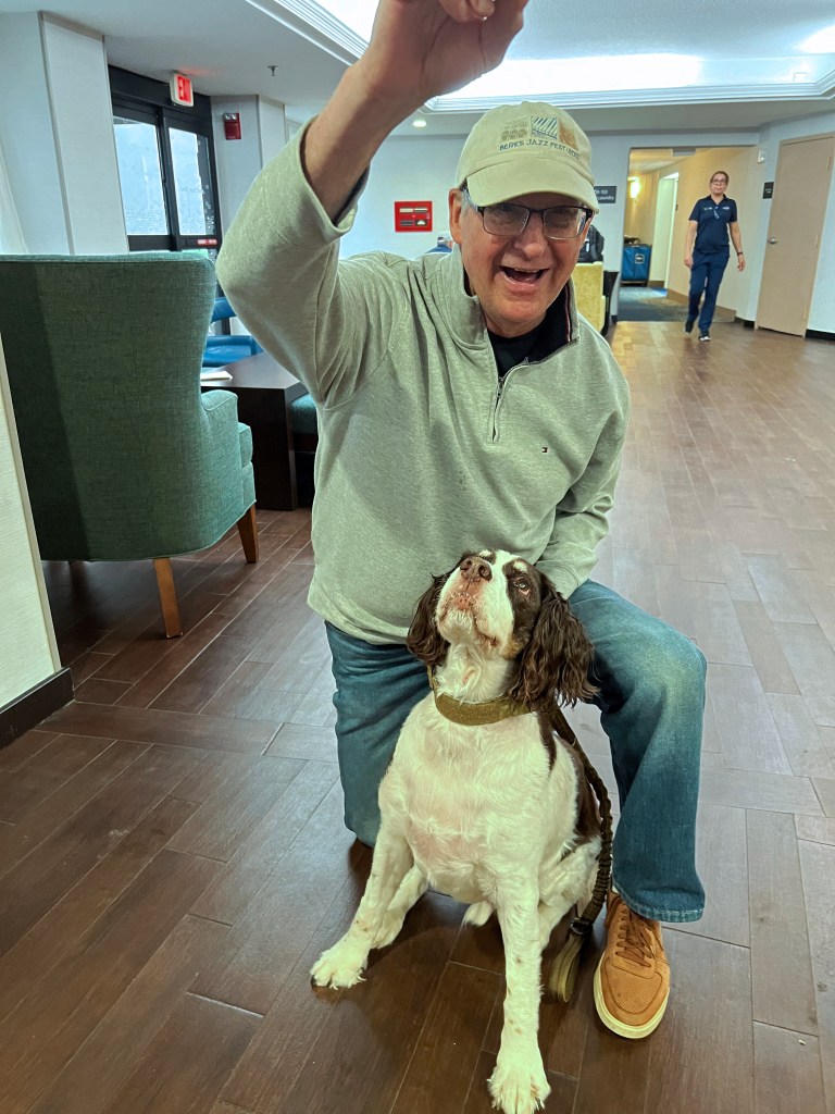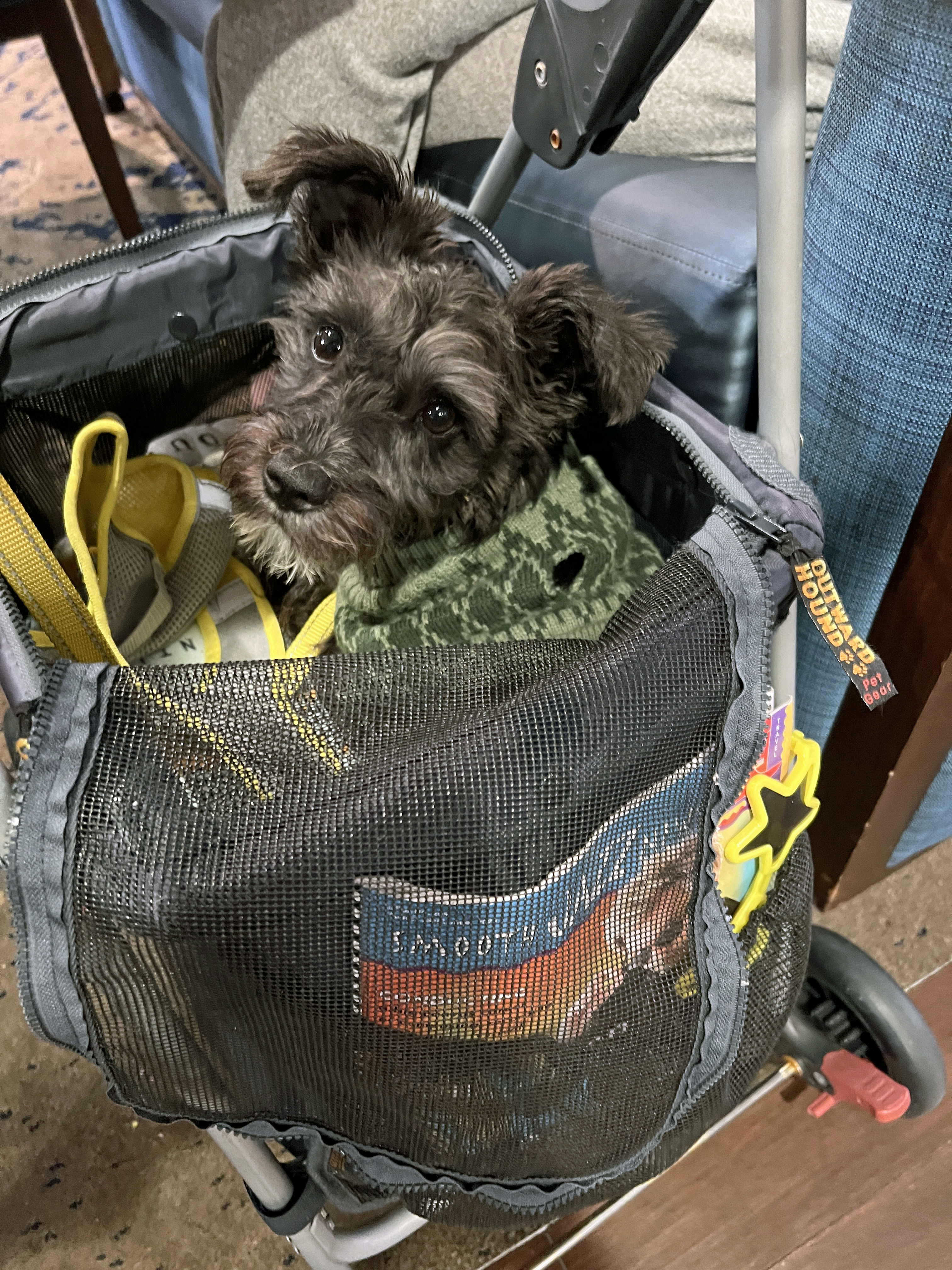 Once back at Hampton Inn, I entered from the south side with my key card and went back to my room. I showered, got dressed in clean clothes, and brought my laptop to the lobby for breakfast and mingling with any musicians or fans I happened to see. Estella Taylor-Greene and Norma Rohadfox were there, Rob and Mel Hoogenboom were there with their dog Olive (third photo below), Mark and Phyllis Abrams had their dog Cody (first and second photos), and Friday night headliner Althea René was there (fourth and fifth photos with Rob, Mel, and Estella).
