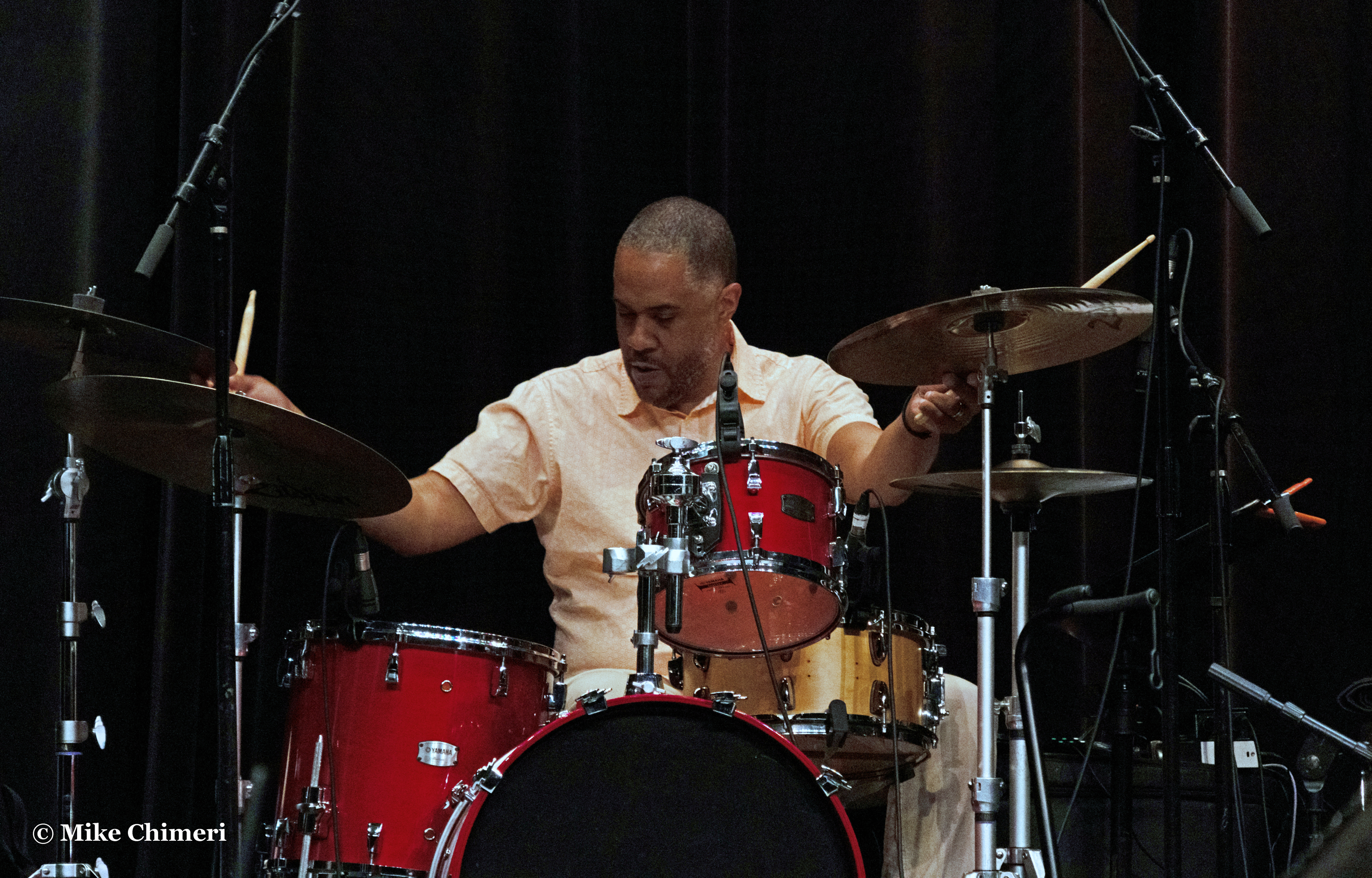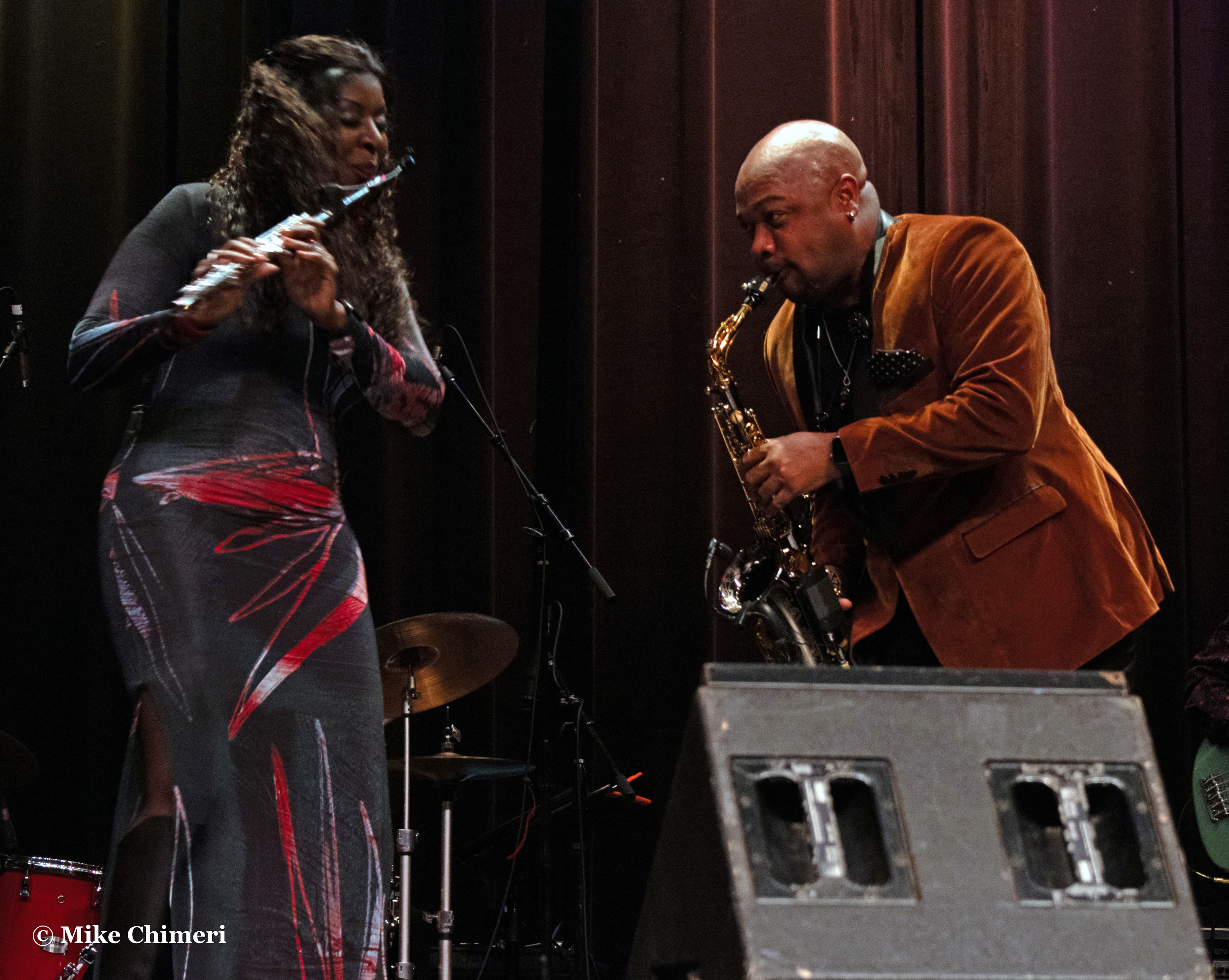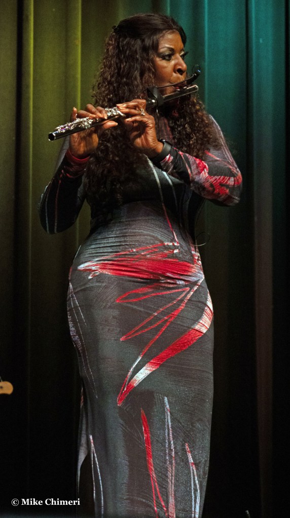 All the while, I sat at the elevated table with my laptop, eating banana muffins and drinking apple juice. (I didn’t feel like eggs or waffles and it was too late for cereal.) On the laptop, I went through the 401 photos I kept from Friday night, deleting anything overly blurry or where Althea wasn’t blowing into her flute’s lip plate or fellow headliner Marcus Anderson wasn’t on his alto saxophone’s mouthpiece. I struck up a conversation with a young couple who were in town for a friend’s wedding as the boyfriend marveled at the photos I was going through. Diane Roth and her partner Rich said hello and I spoke them for a bit, as I did with John and Theresa Monteverde. I’ve seen John and Theresa since the Houndstooth Pub shows in the early 2010s. They live in Merrick here on Long Island and John was retired from working at the Citibank in Freeport, near my day job. There wasn’t any caffeine free tea available in the lobby; only black tea, which has caffeine. So, John offered a green tea bag from his room and I drank from that instead.