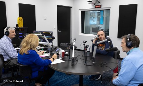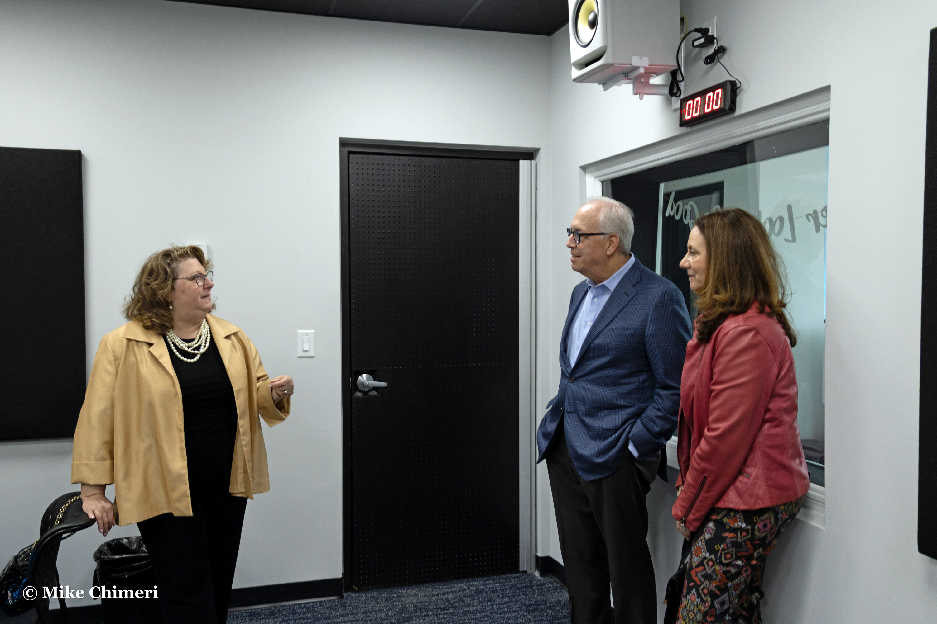 Jeff Kroll and WCWP station manager Dan Cox speaking with Dr. Kimberly Cline and Vice President for University Advancement Kerry Kruckel: