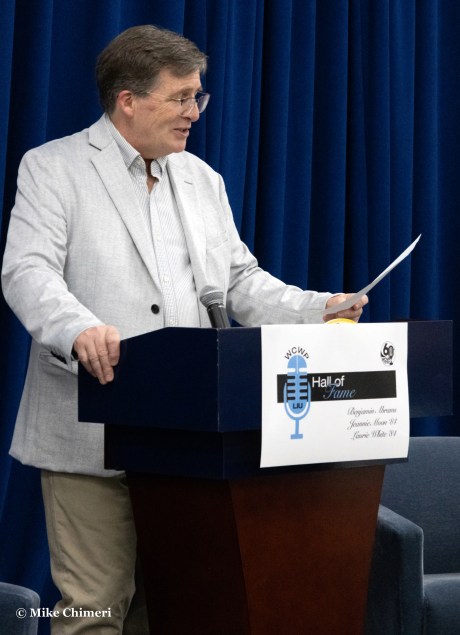 Dan Cox read a statement from WCWP founding member Art Beltrone, commemorating the FM station’s 60th anniversary: