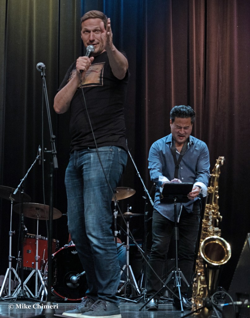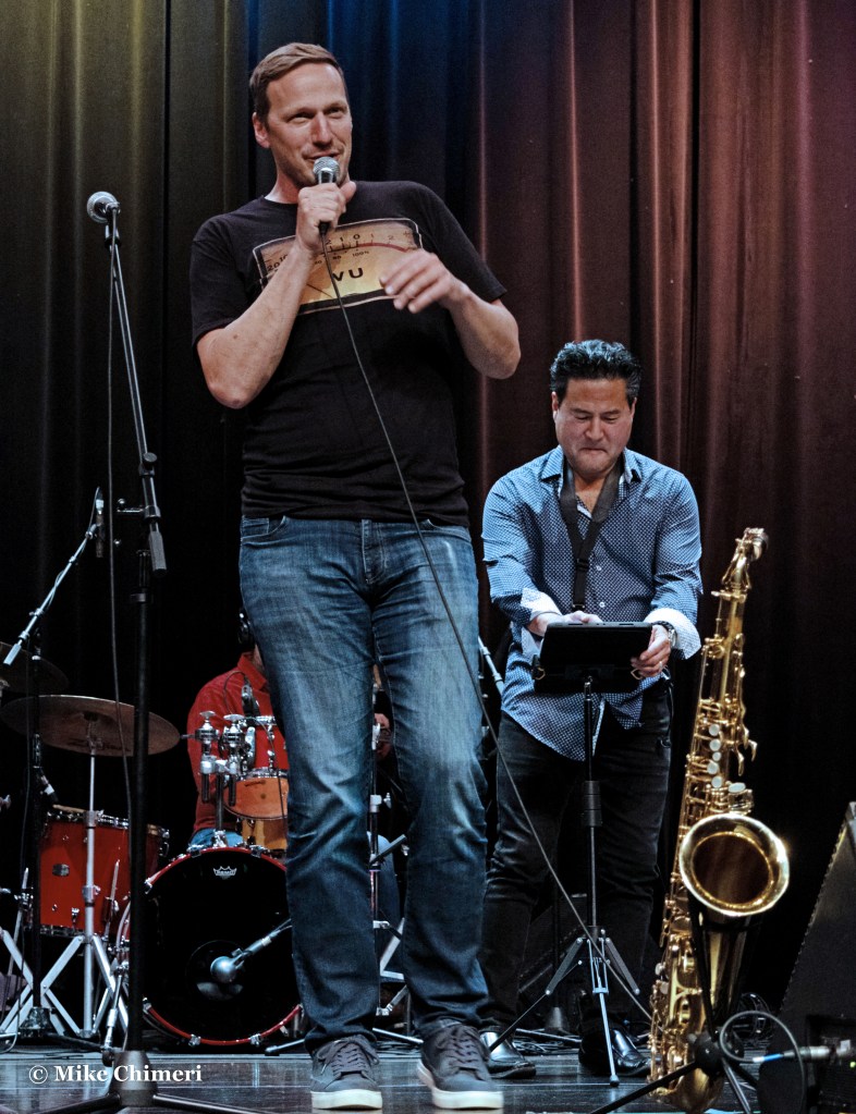 Out in the lobby, Neil Marks talked to Strictly Jazz hosts John LiBretto and Hank Neimark about his long trip to LIU Post earlier Friday.