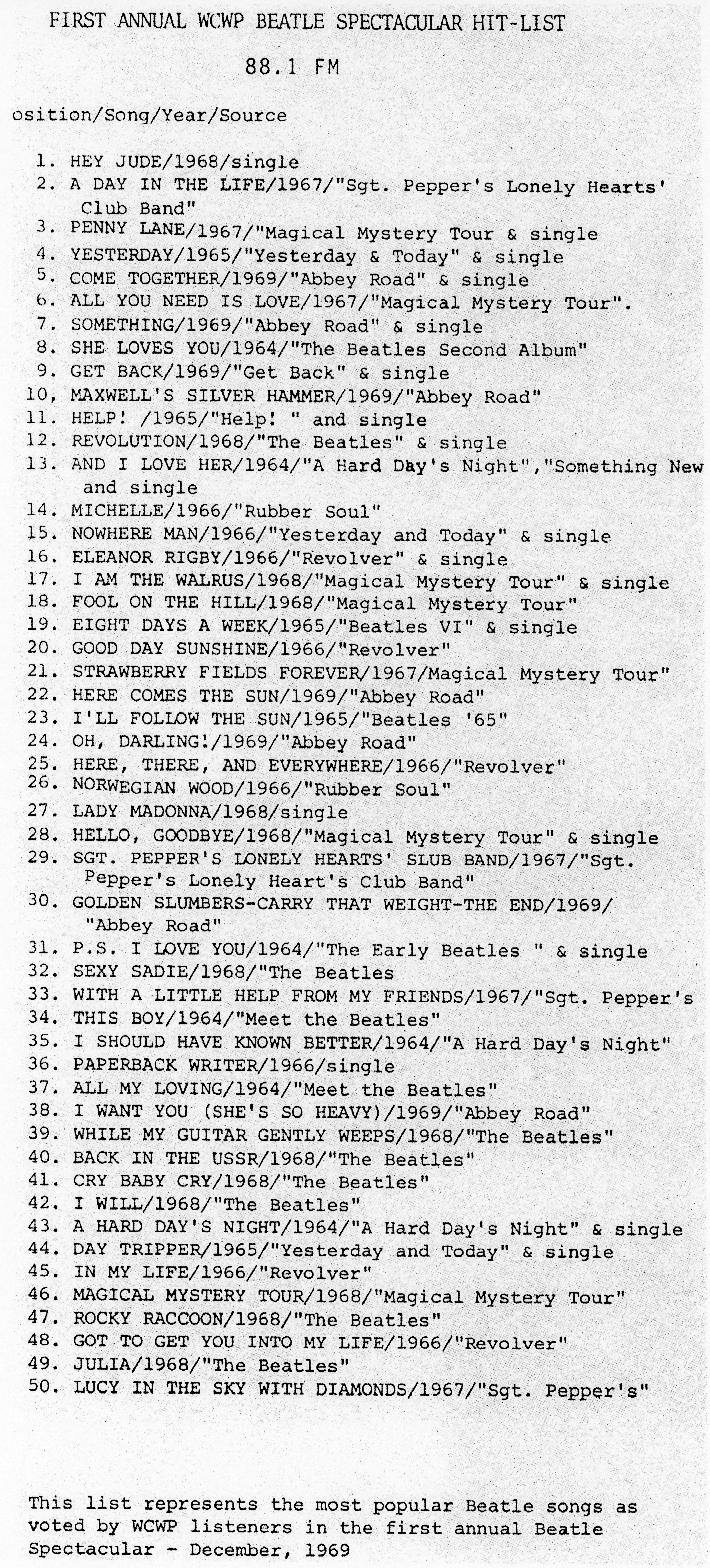 Incidentally, this is my scan of a copy of the First Annual WCWP Beatle Spectacular Hit-List: