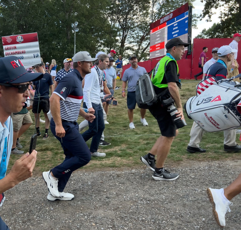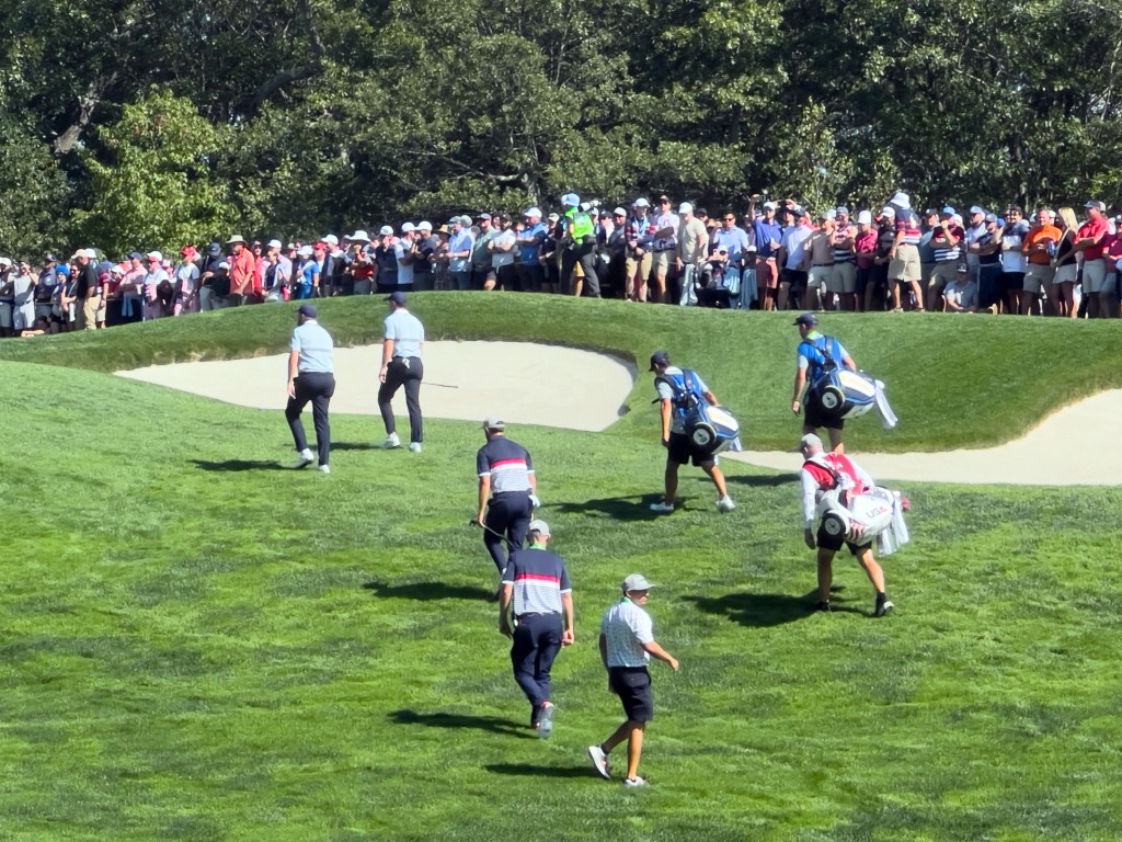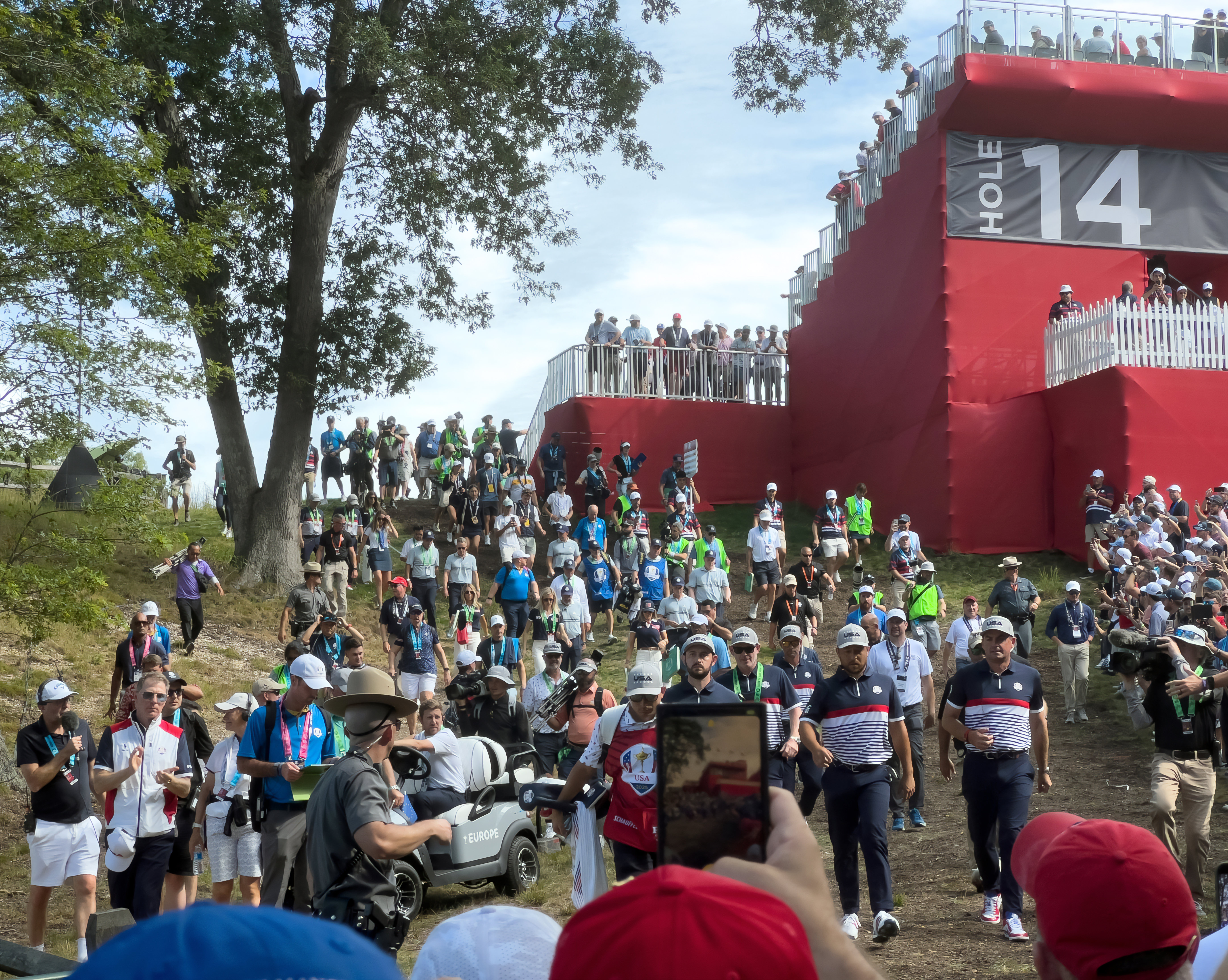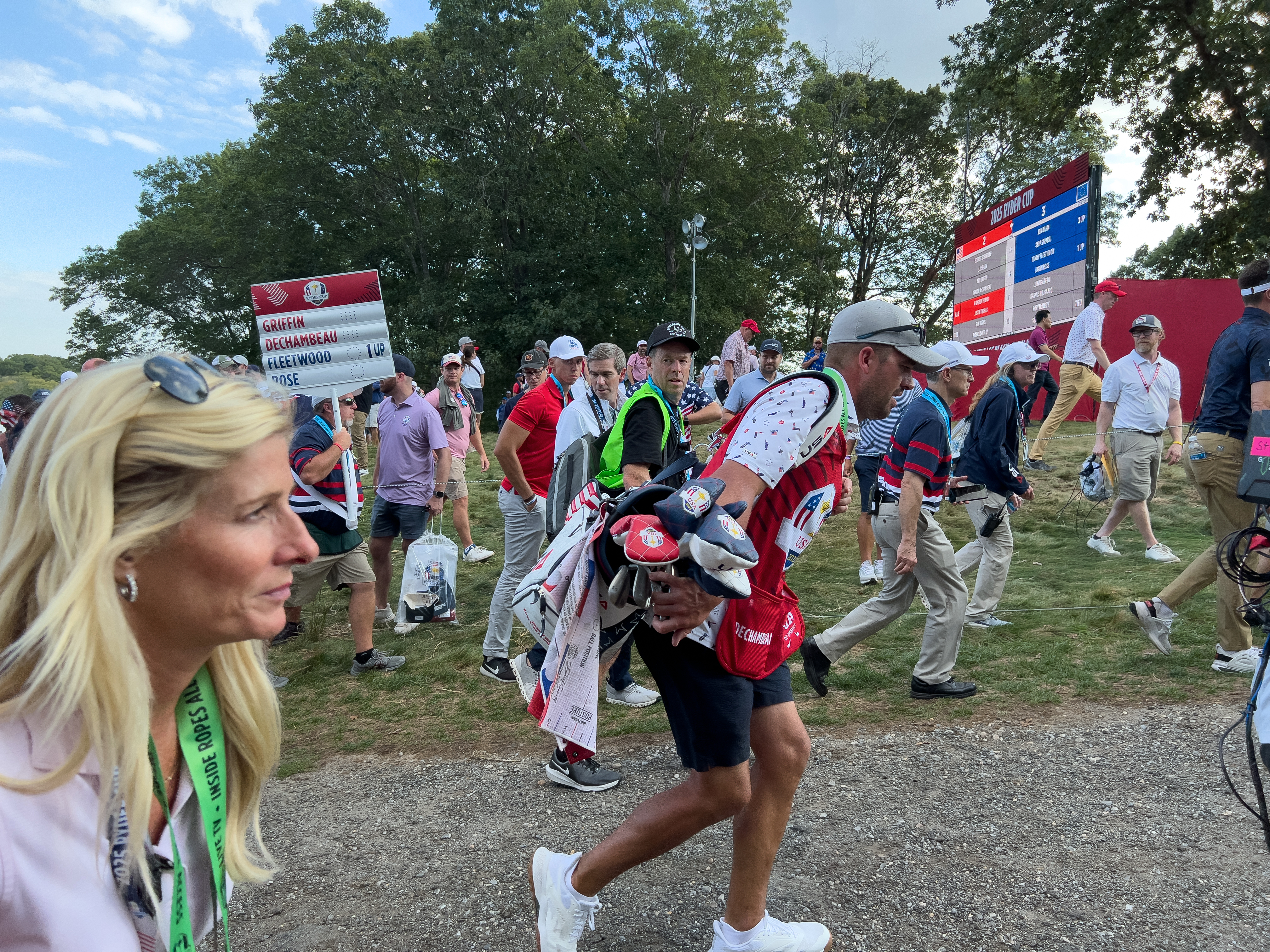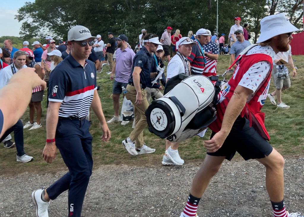Even though my dad Bill and I were deferential to visiting European fans and respectful of Team Europe golfers, vice captains, and captain Luke Donald, the loss still hurts. So, this won’t be an in-depth recap, at least not verbally, and I won’t link to any media articles. The extensive gallery below will speak a thousand words per photo. That includes photos of players, caddies, vice captains, and captains of both teams. (St. John’s University alumnus Keegan Bradley was Team U.S.A. captain.)