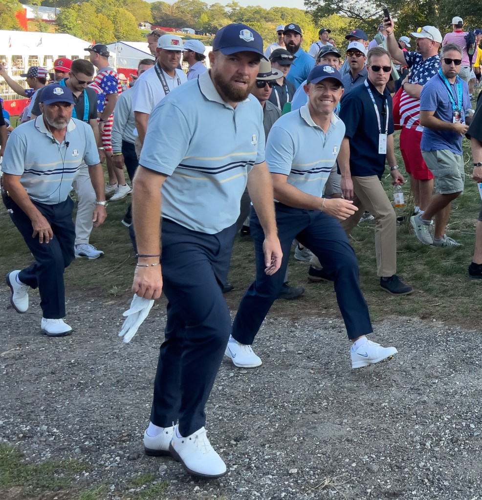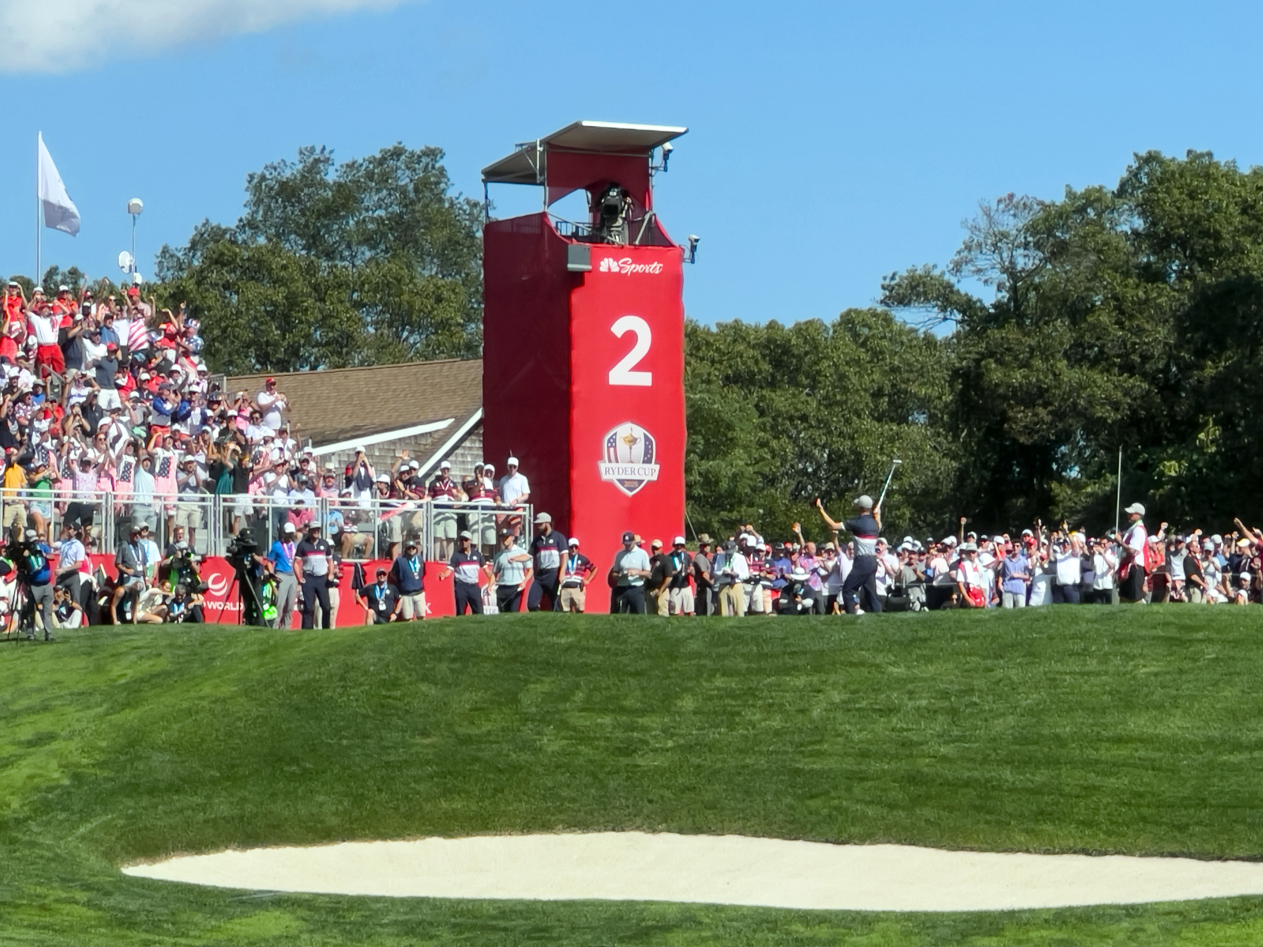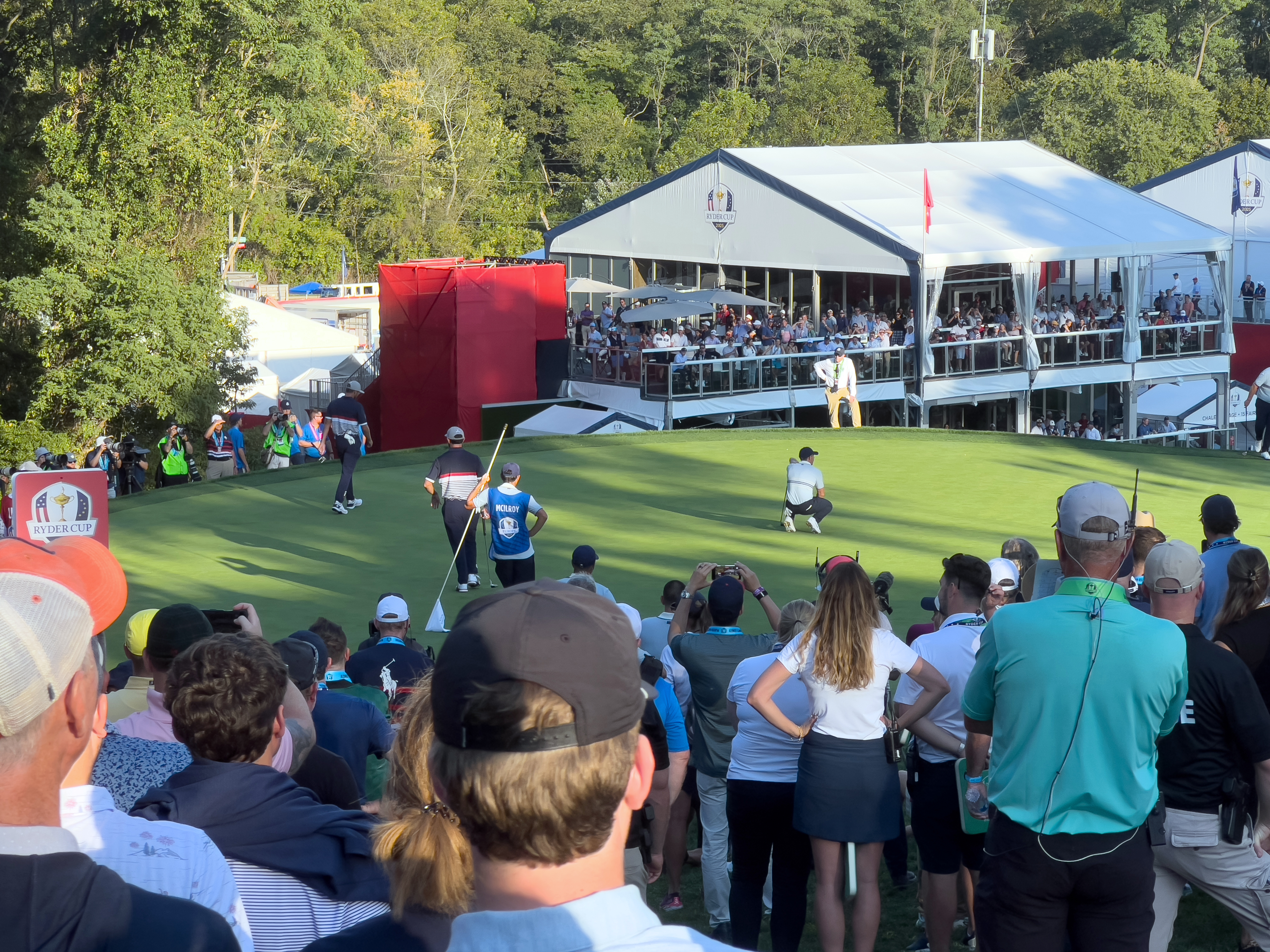 Not only did I hear that song endlessly in person on Friday, September 26, but it was sung as Europe defeated the U.S. 15 points to 13. The U.S. teams lost too many foursome and four-ball matches Friday and Saturday to make a complete comeback Sunday. (10/2 UPDATE: Europe clinched when Shane Lowry, who you’ll see front and center in a few photos, halved his singles match with Russell Henley with a birdie at the 18th hole. That gave a Europe a 14-11 lead over the U.S., rendering all other matches inconsequential.)