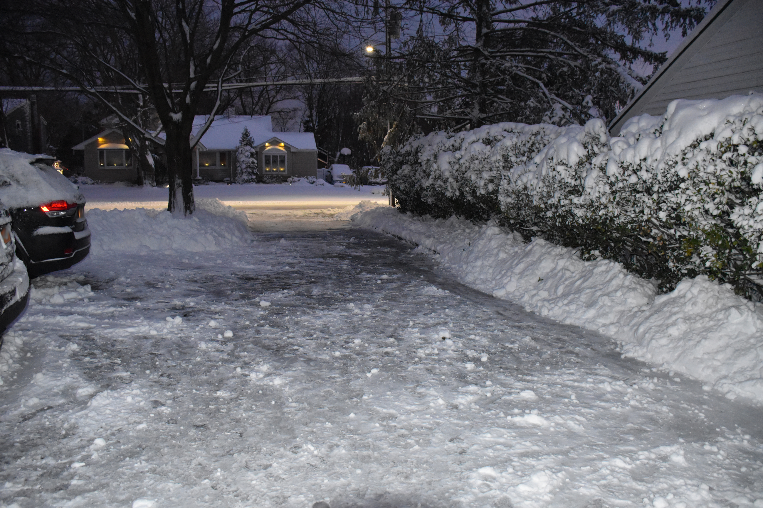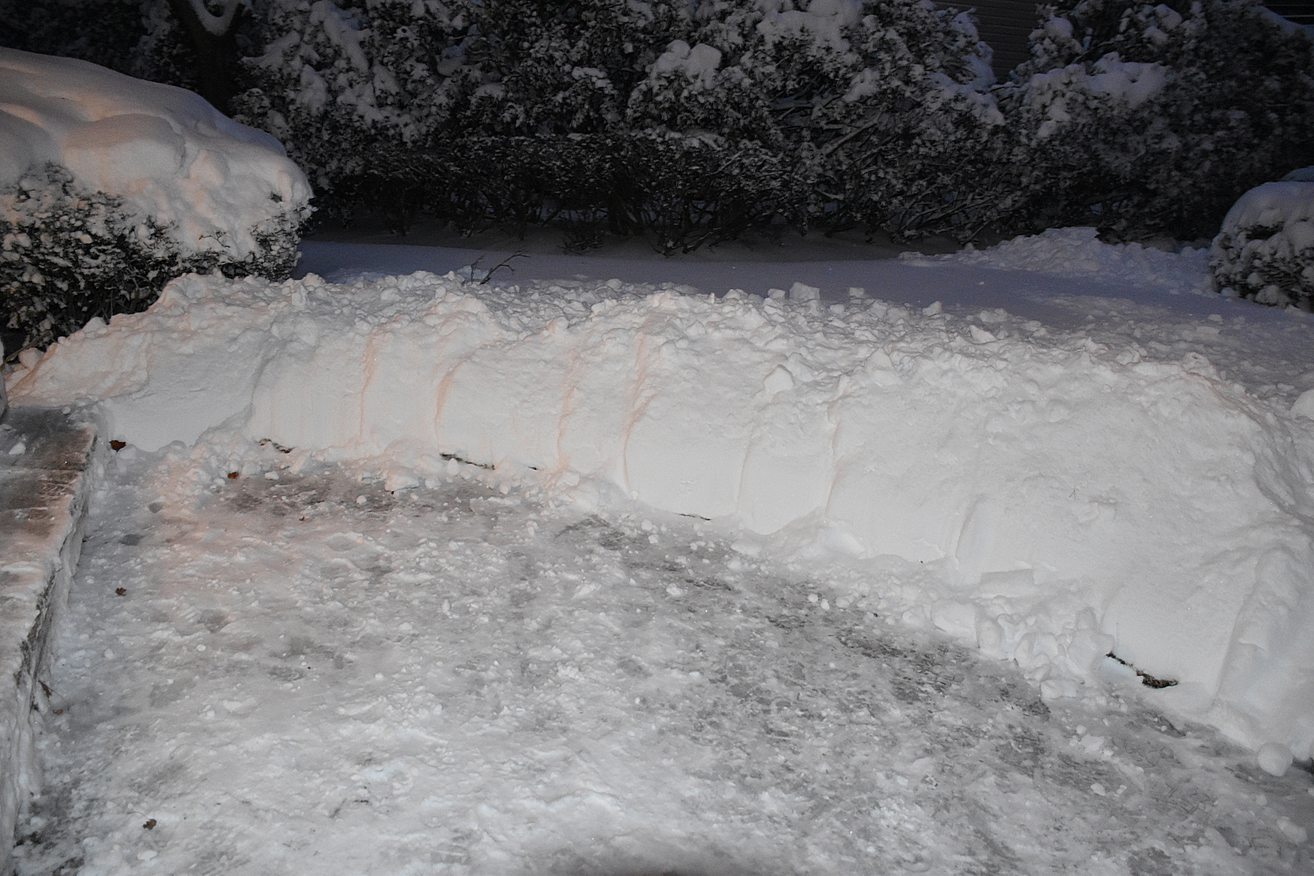 I woke up at around 7AM to the sound of sleet pelting my east-facing window. The changeover had happened after only a few inches of snow accumulated. In the next hour, sleet began to mix with, and change to, rain. The rain turned the snowfall to slush, but didn’t wash it away. That’s where I came in. I went outside just before 9:00 and shoveled the driveway except for its edge in case snow plows came through again. I wouldn’t want my work to be undone in that area.