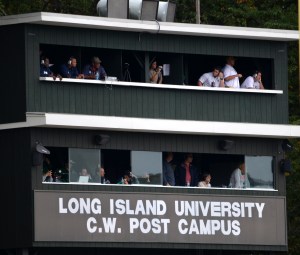 We’re on the lower level of the press box…..hard to see clearly, but on the far right side, that’s Pat Kroll, sitting next to her is Dan Cox, standing next to Dan with the red shirt on (glad I had red on that day for identifying purposes) Jeff Kroll, and Neil A. Marks is standing next to me. Sat 10/19/13. Post 58 Pace 0. Pat was coordinating with Joel Feltman (down on the sidelines) for field interviews. (sign still says CW Post Campus!)